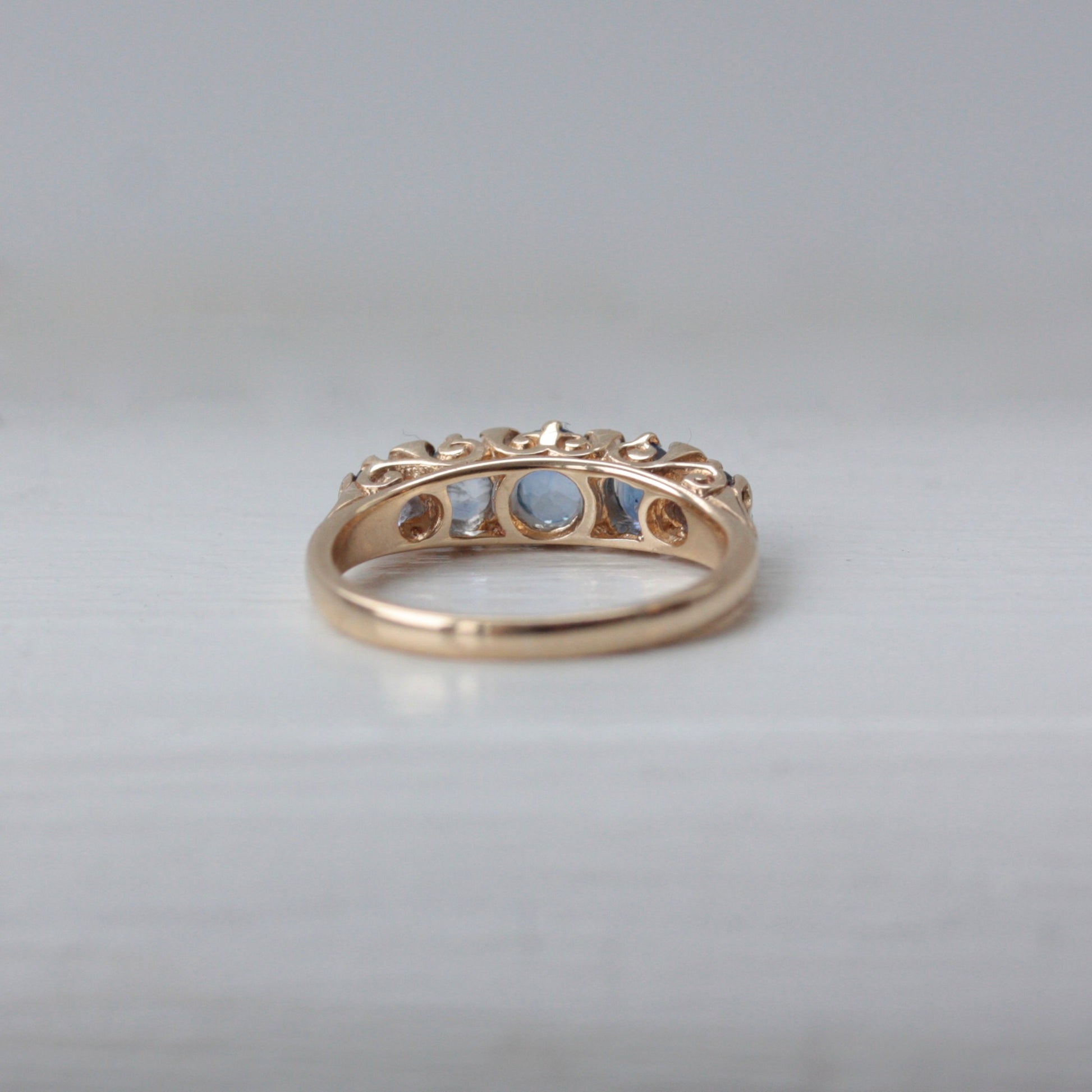 A very pretty vintage 9ct gold ring set with three mid to light toned sapphires.