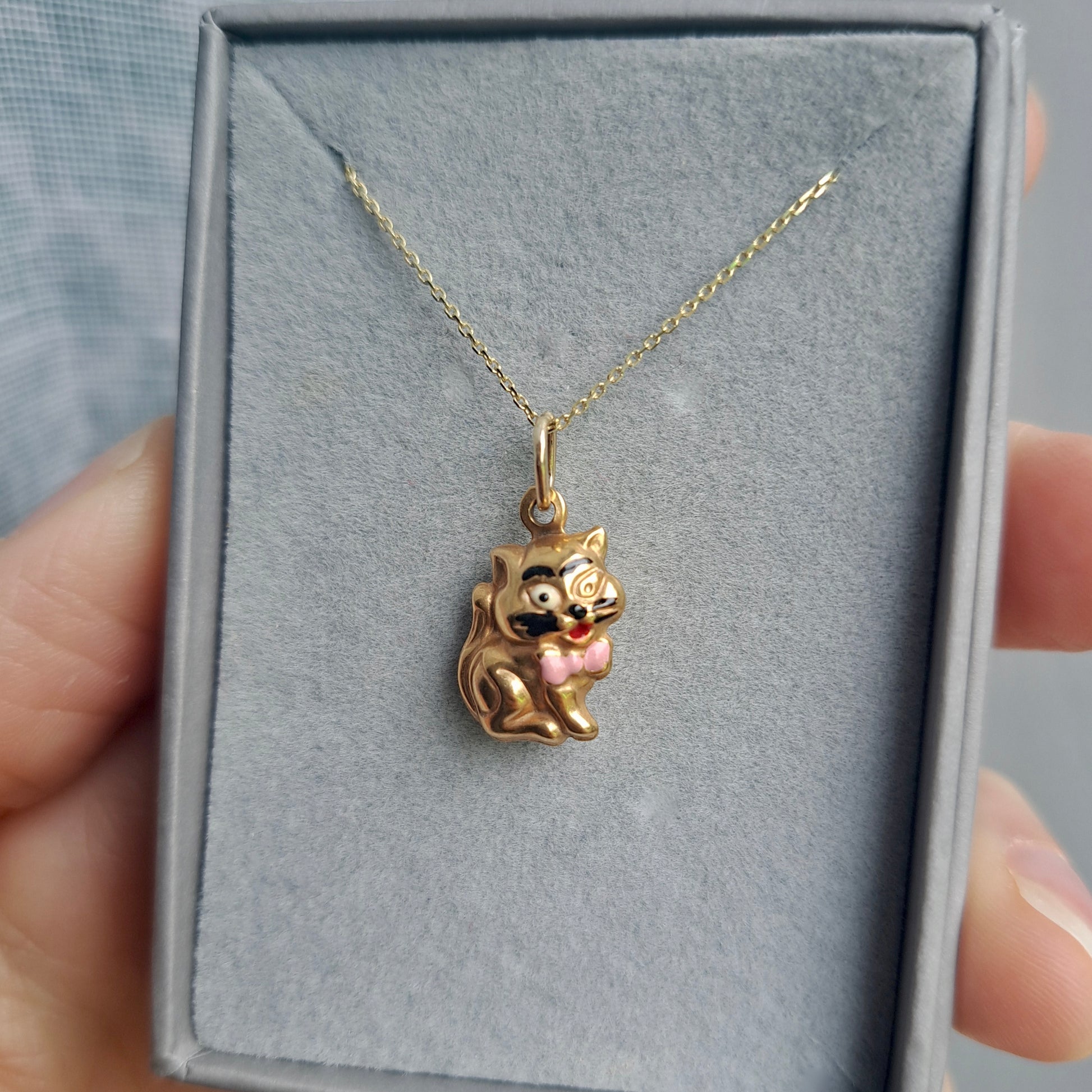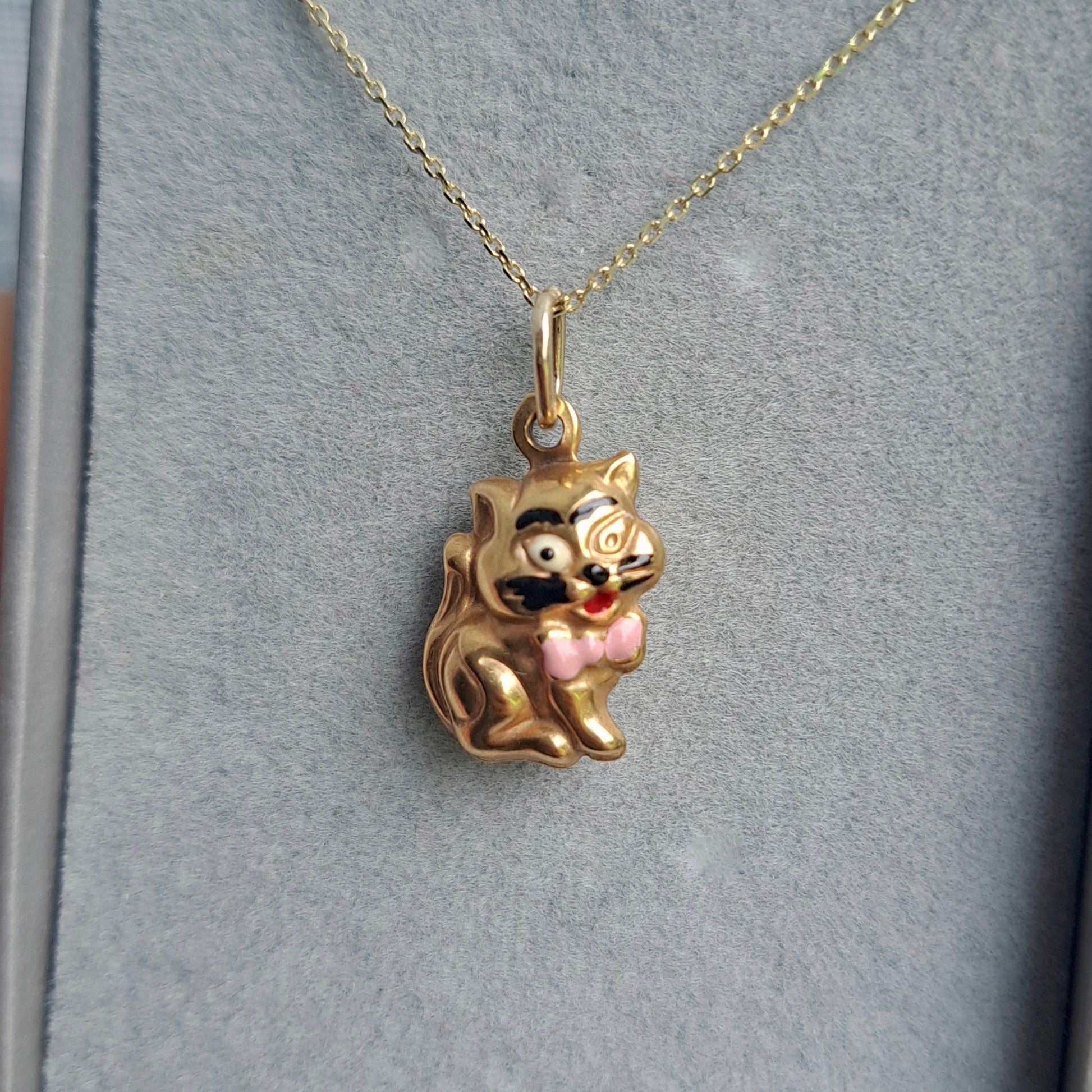 Vintage 9ct Gold and Enamel Puffy Cat Charm, 1990s
