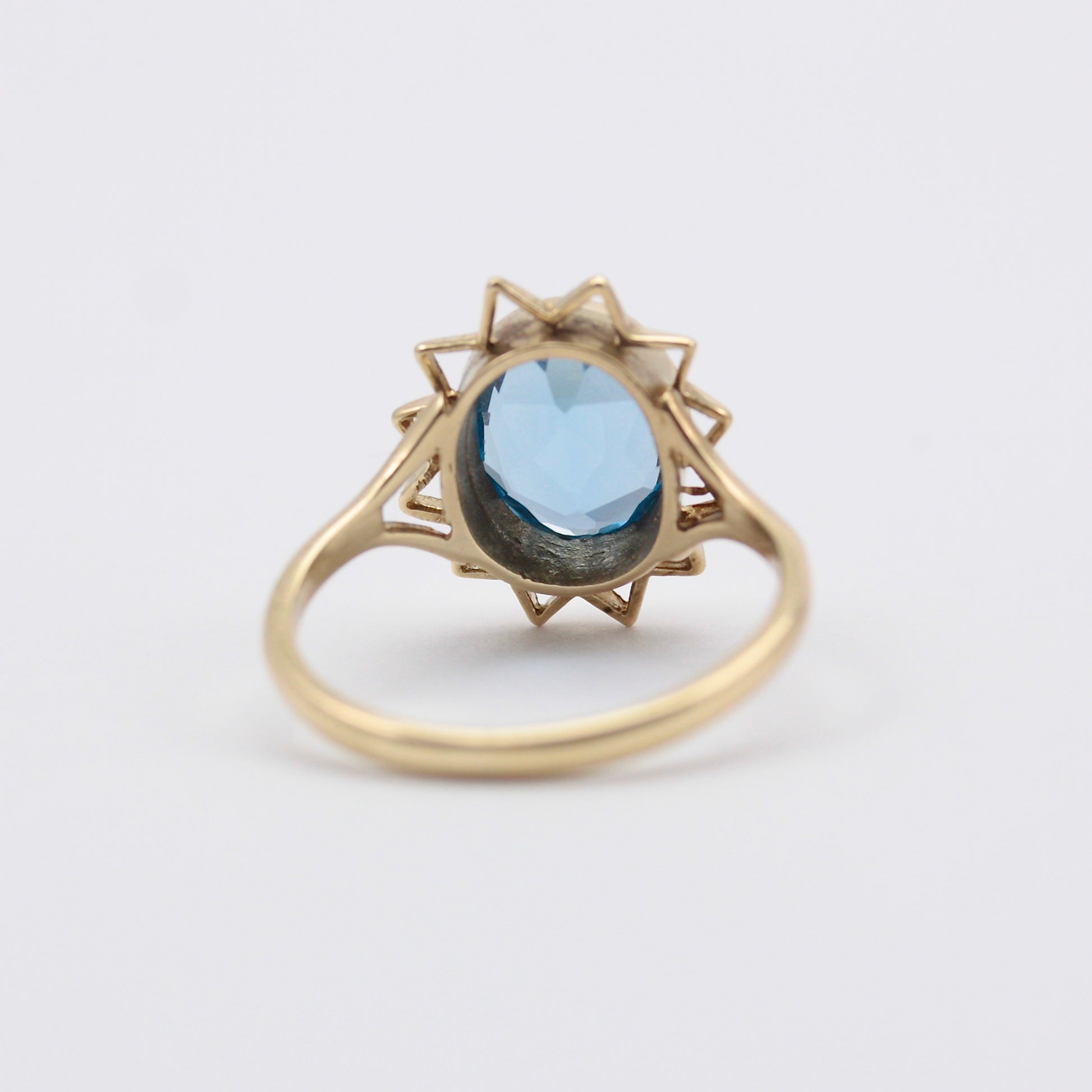 A lovely vintage 9ct gold and topaz ring, the design of the frame giving the appearance of a sparkling blue sun!