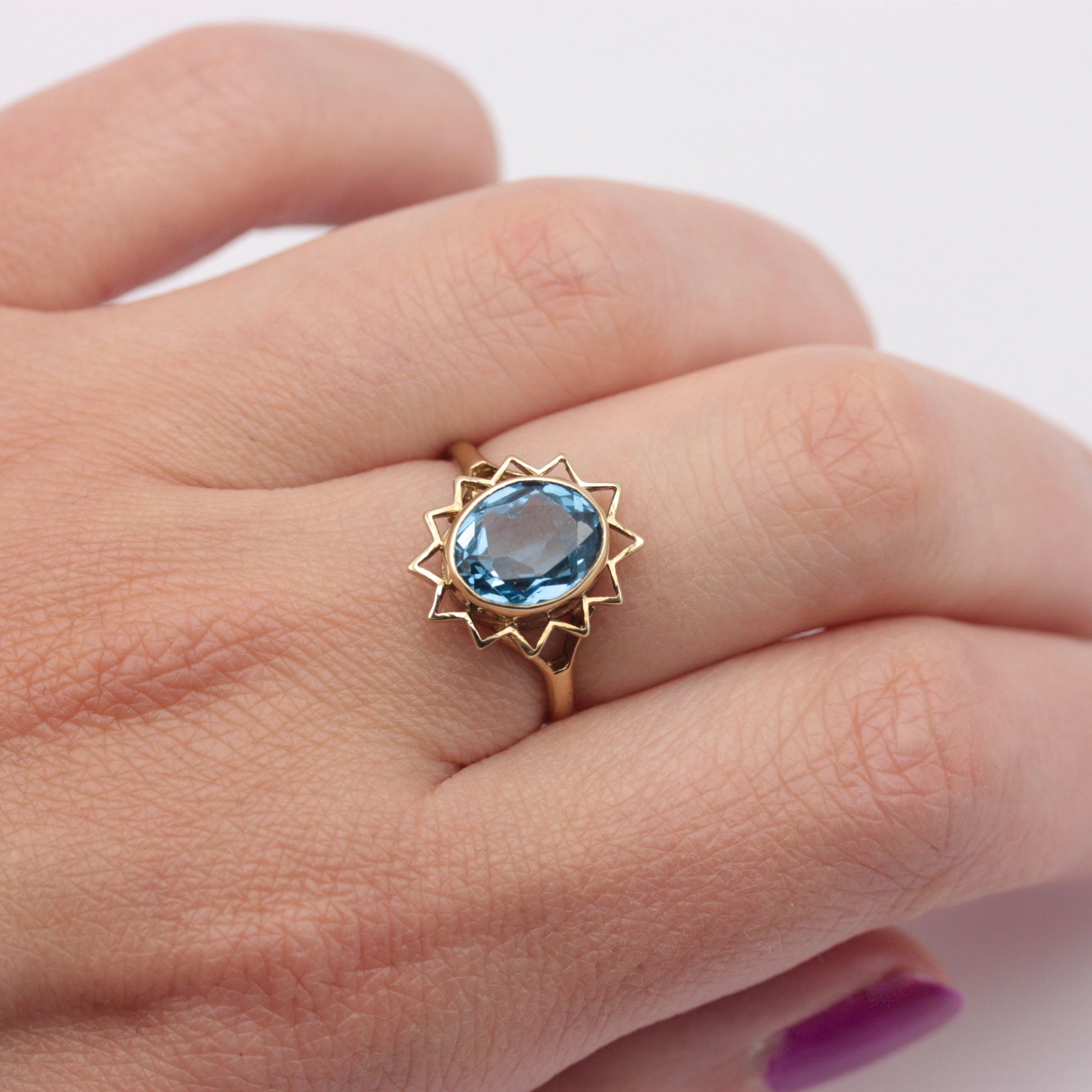 Vintage 9ct Gold Blue Topaz Sun Burst Ring, 1979