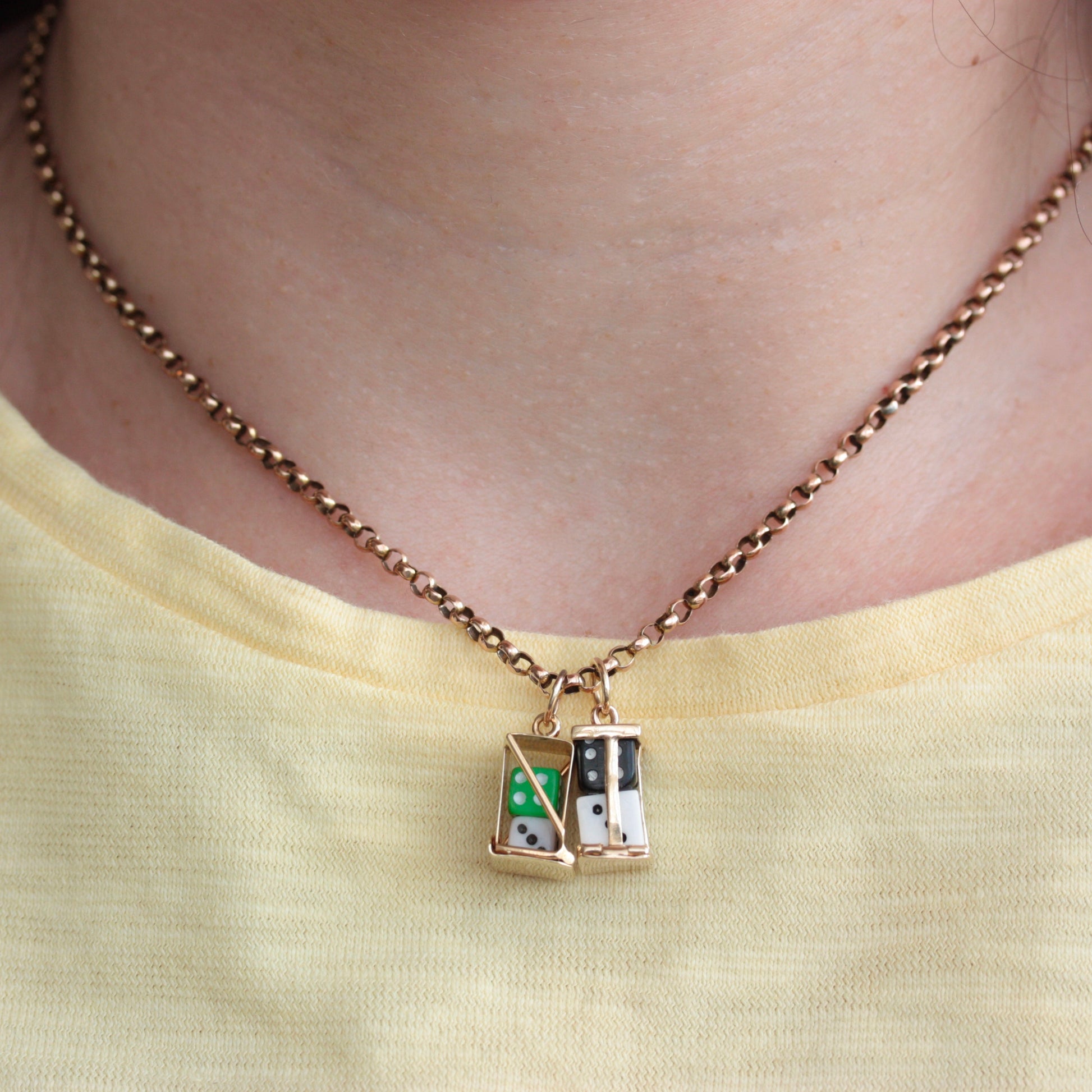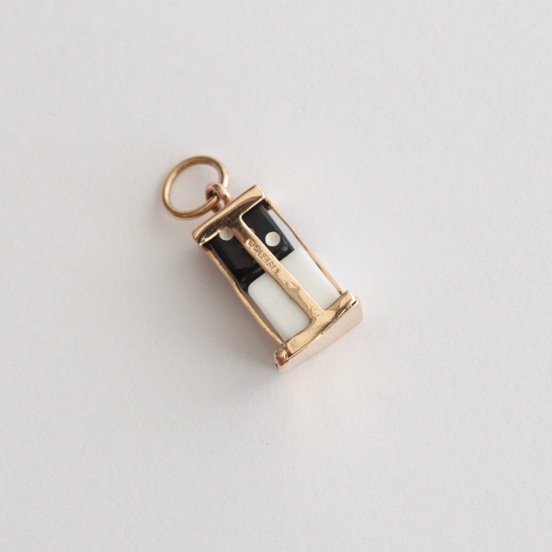 A fun vintage charm, with two dice (one black, one white) inside a 9ct gold "cage".
