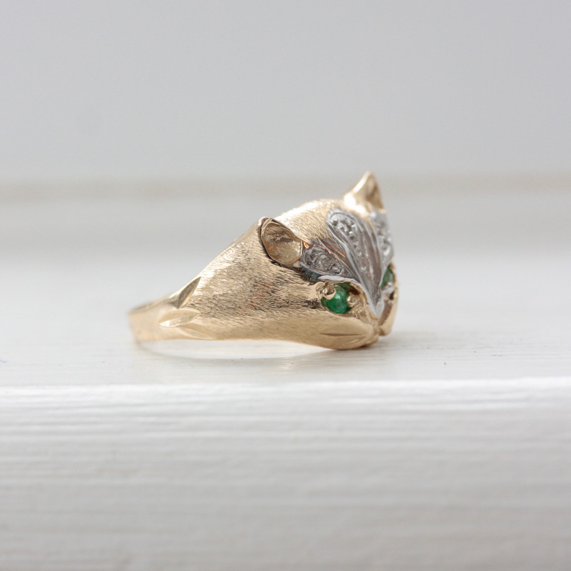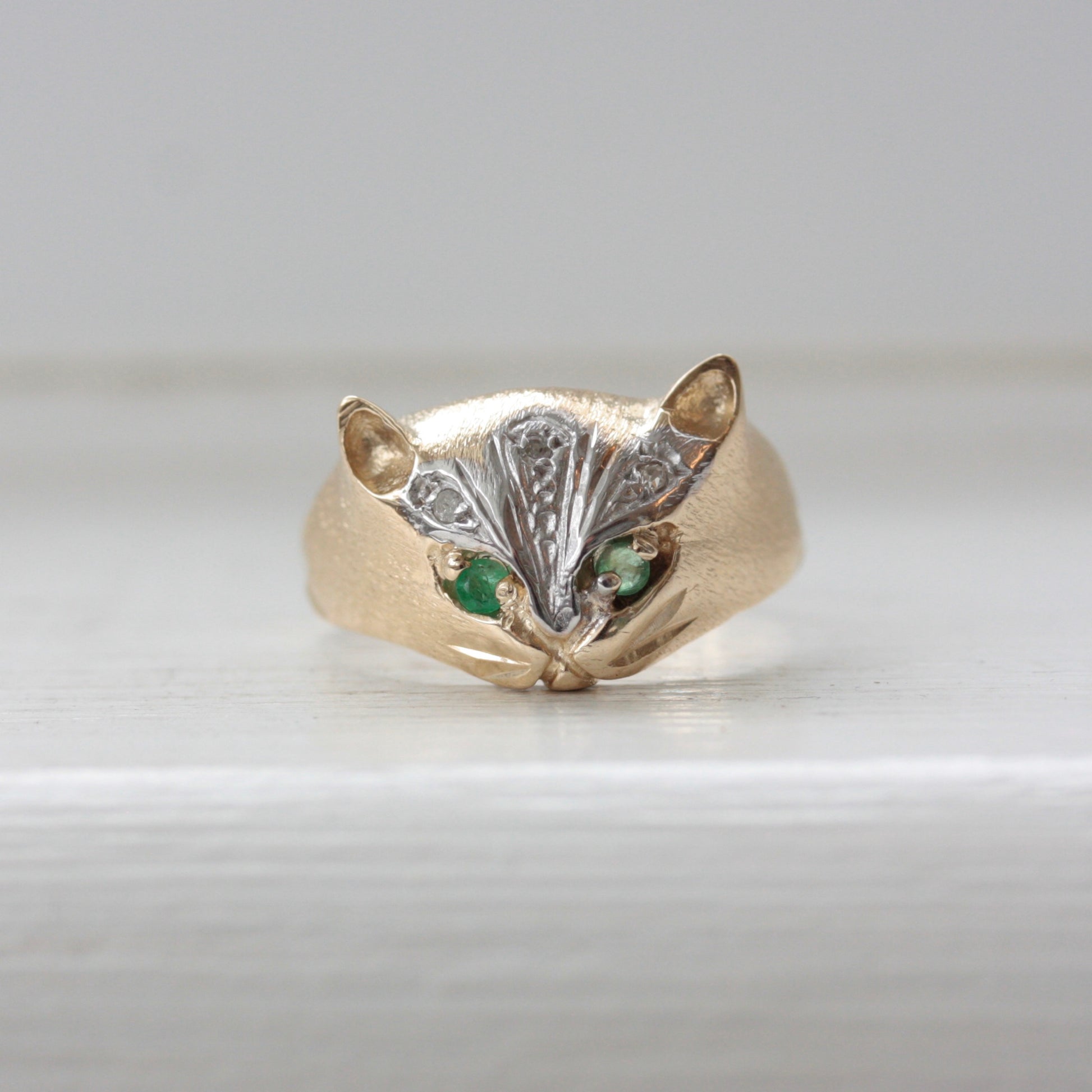 A gorgeous vintage cat ring in solid 9ct yellow gold, with a brushed gold texture to the face, emerald eyes, and three tiny diamonds set into white gold along the forehead.