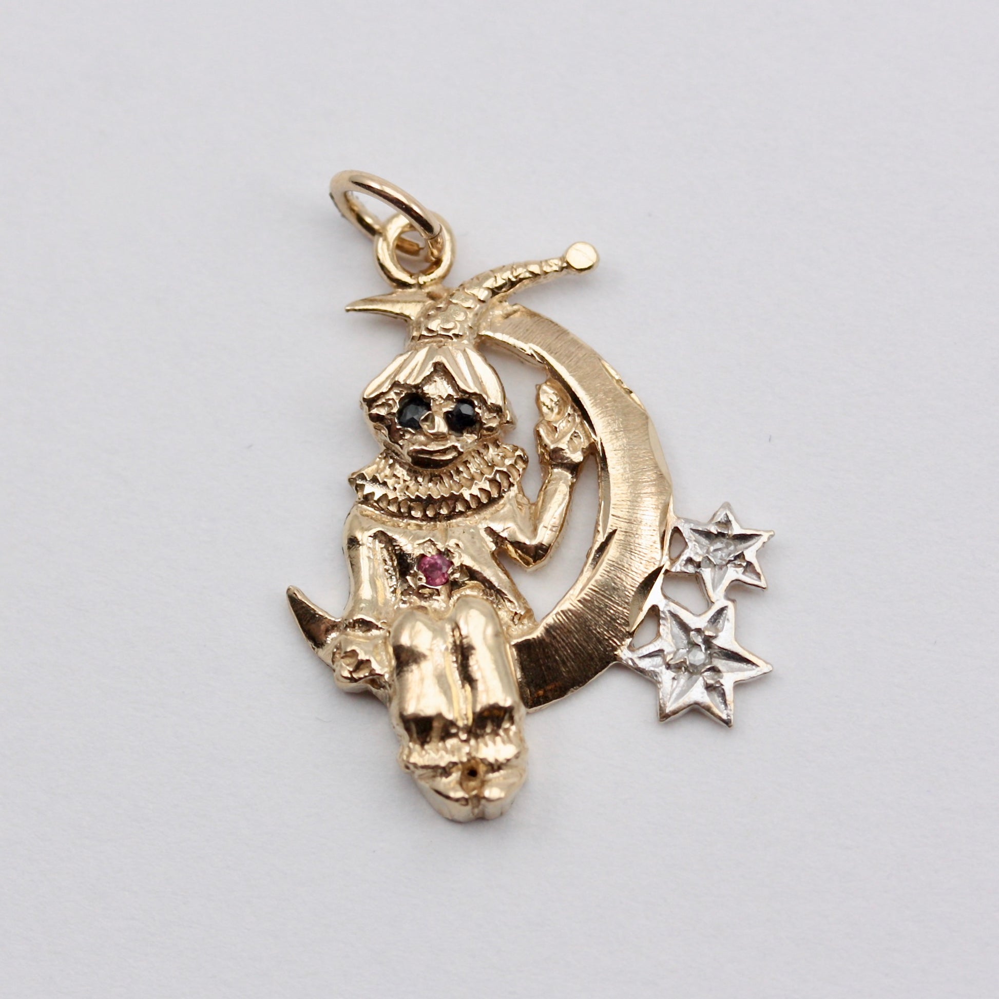 A vintage solid 9ct yellow gold clown on moon charm, with dark sapphire eyes, ruby button and two tiny diamonds in the stars.