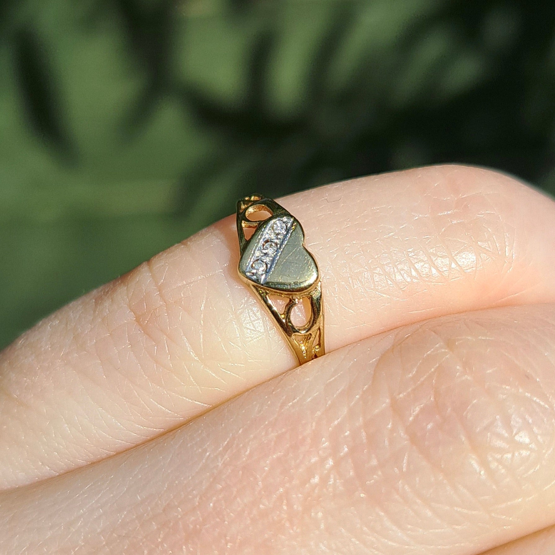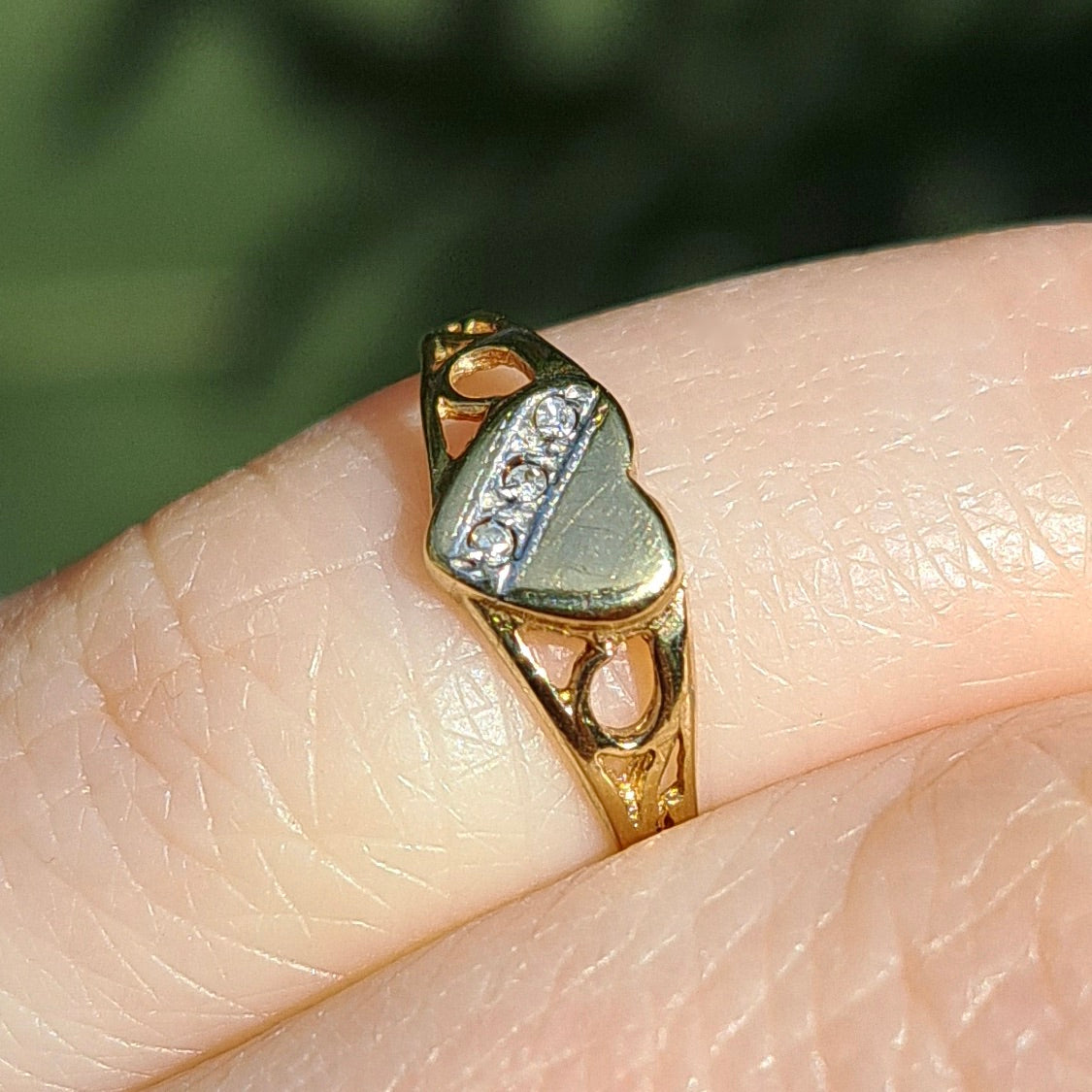 A small sized 9ct yellow gold heart signet ring set with three tiny diamonds.