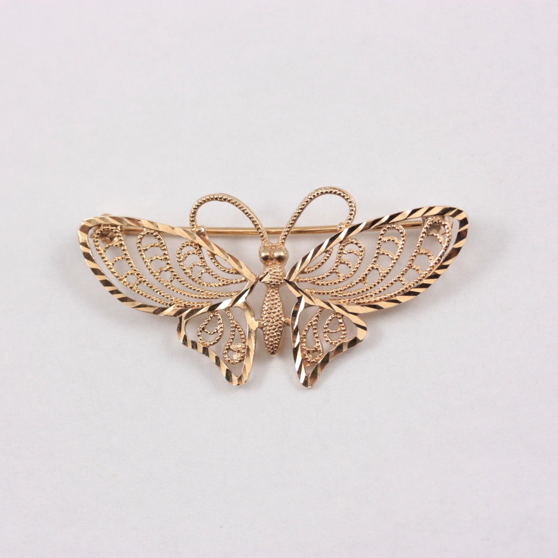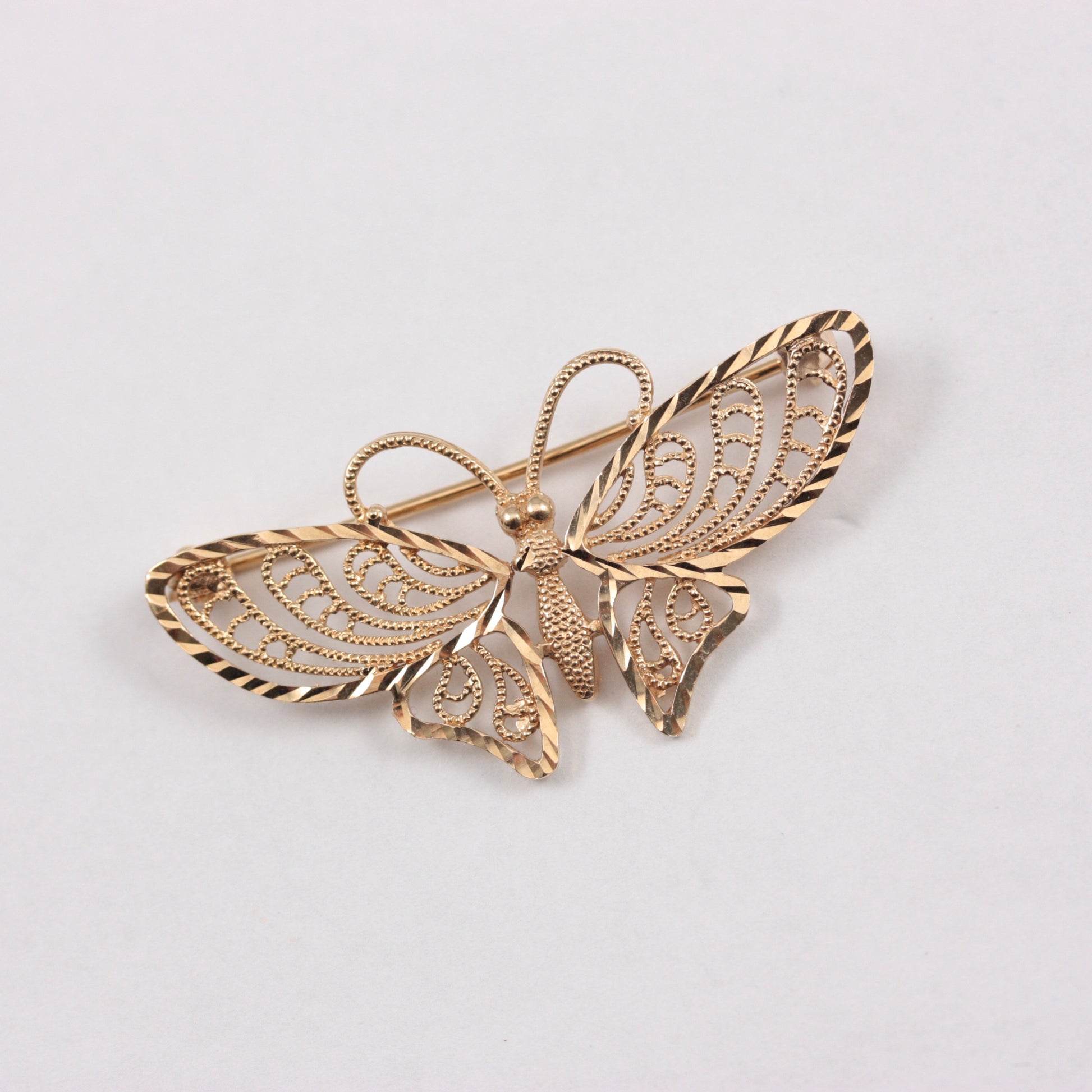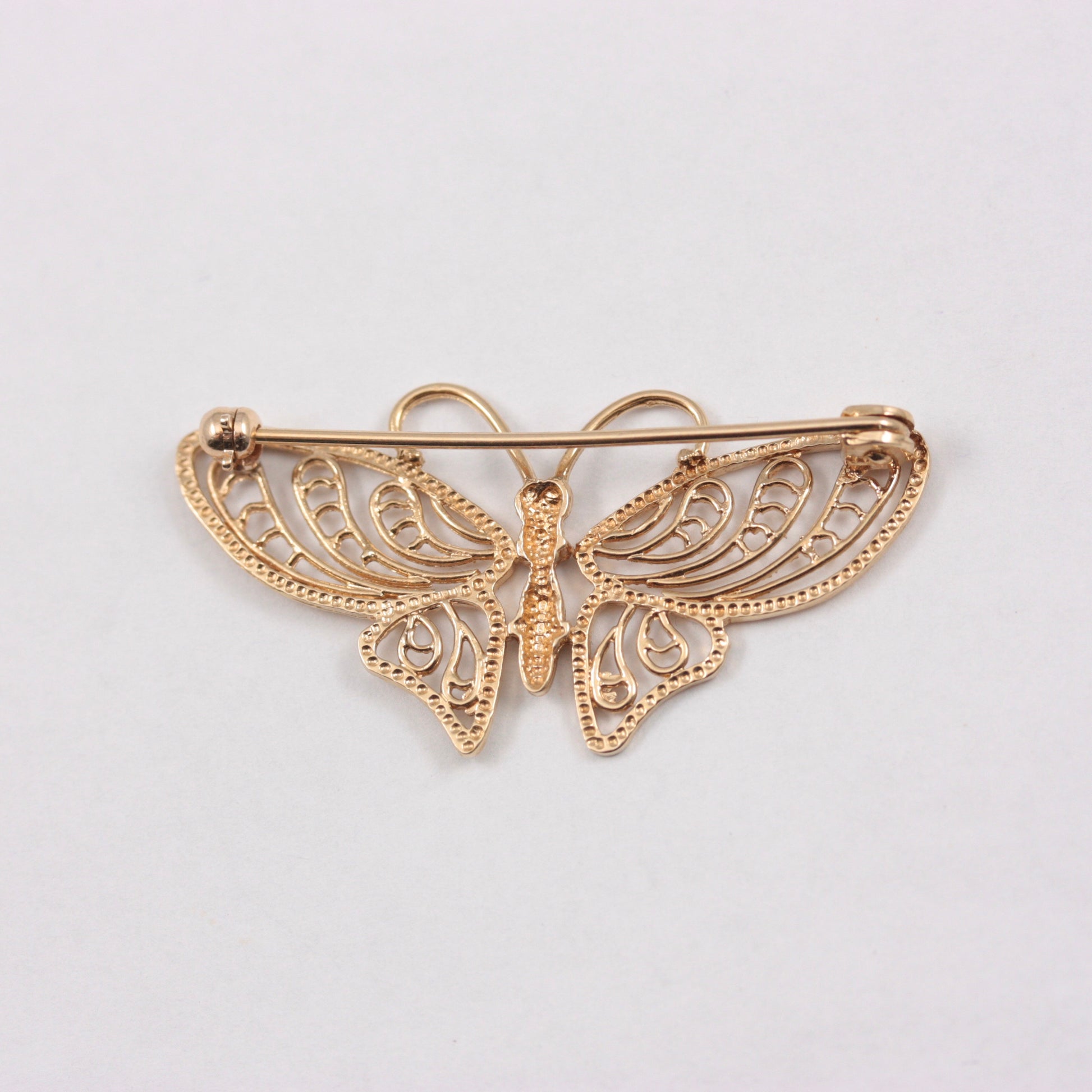 A vintage 9ct yellow gold butterfly brooch in filigree design.
