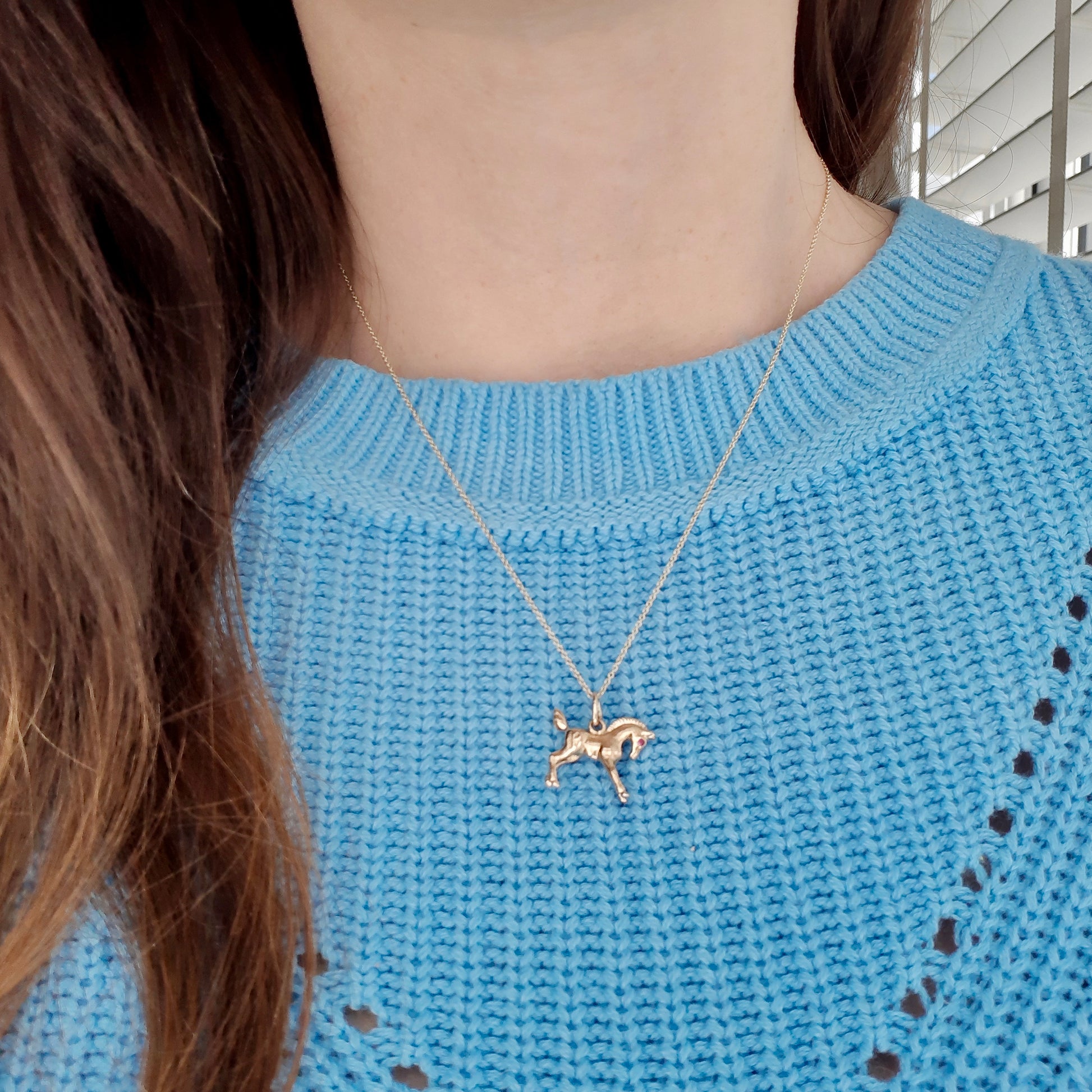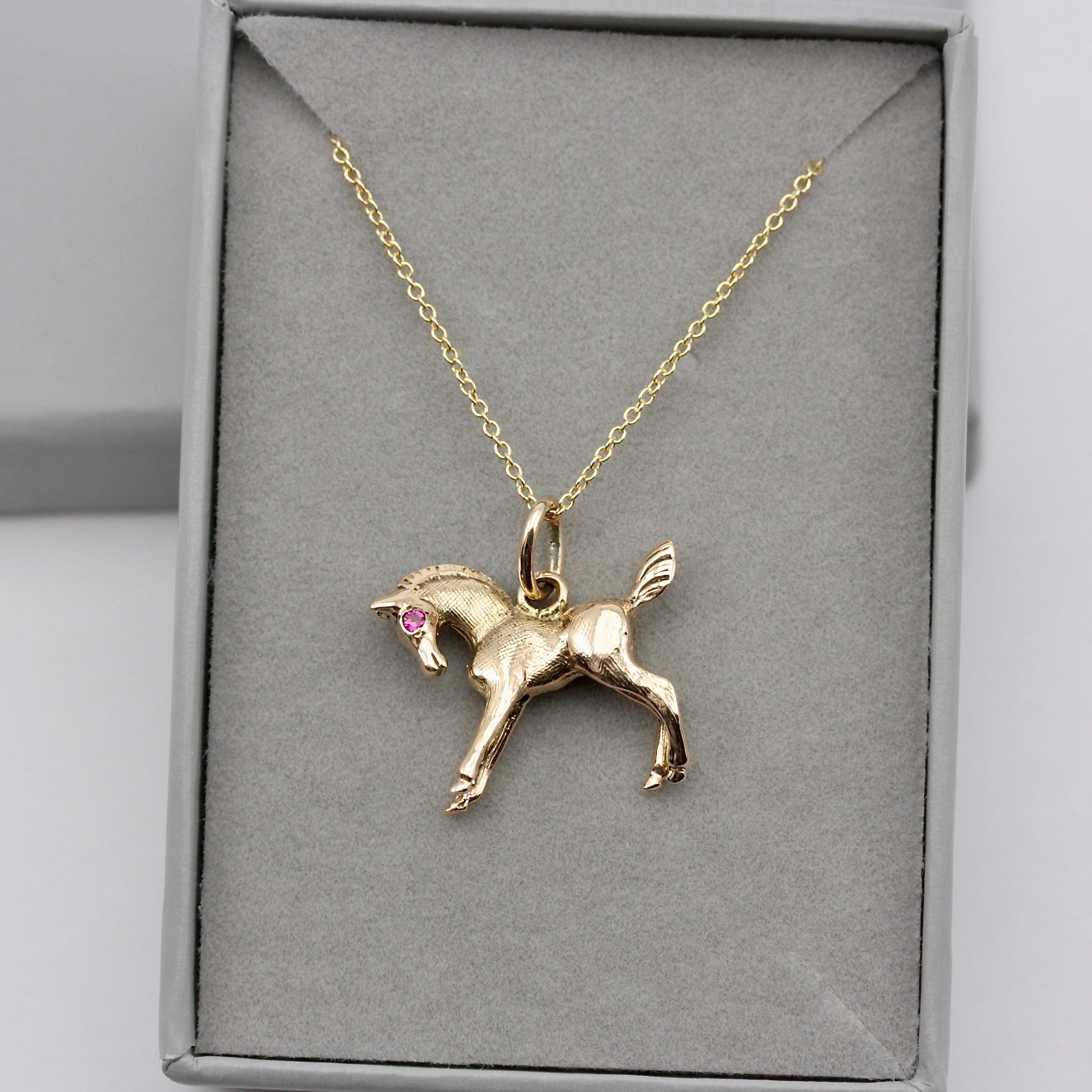 A beautiful solid 9ct yellow gold horse pendant / charm with ruby eyes.