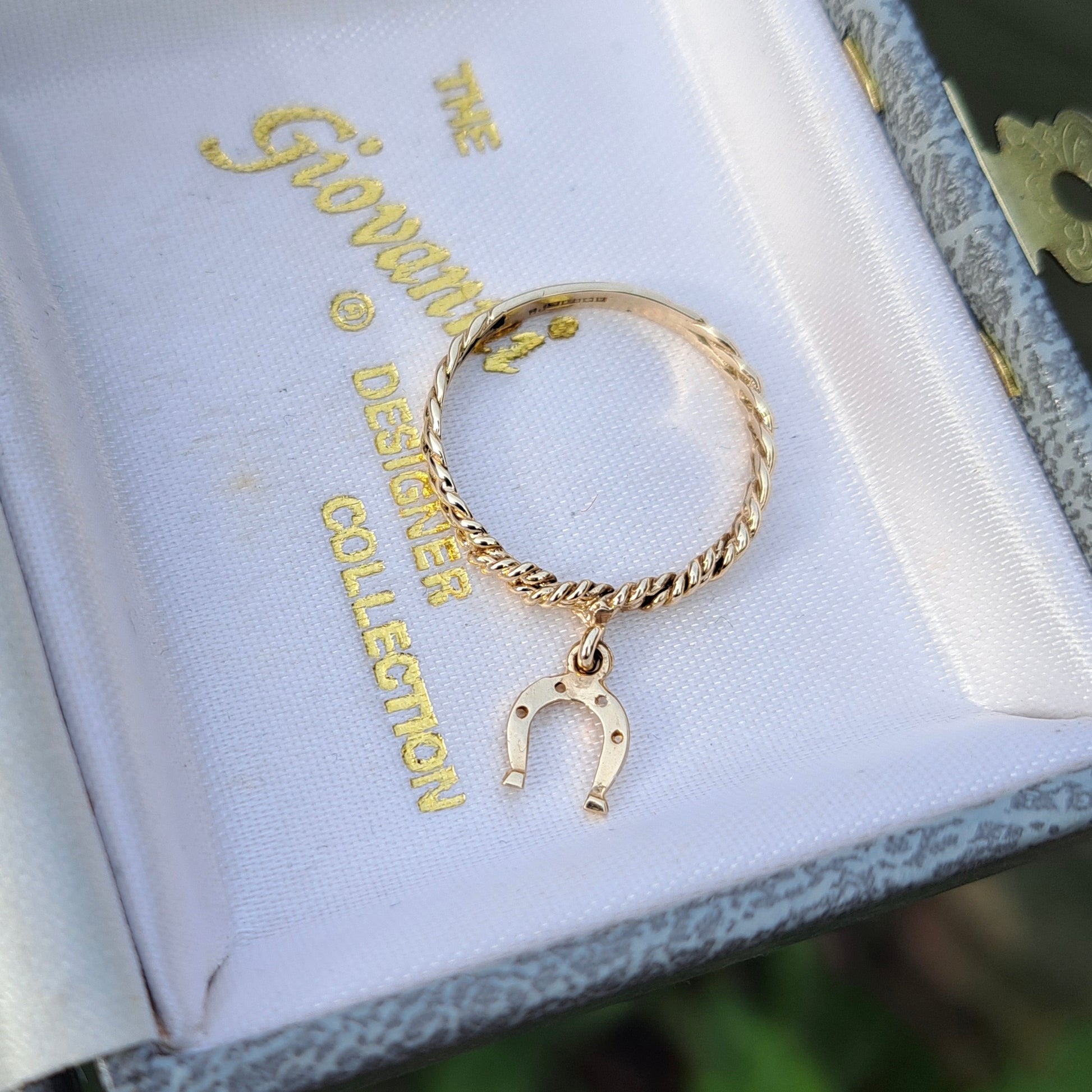 A lovely vintage 9ct yellow gold ring with rope twist design and horseshoe dangle.