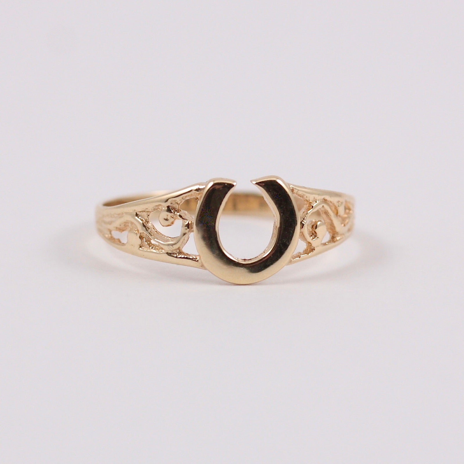 A vintage 9ct gold horseshoe ring with detailed open shoulders.