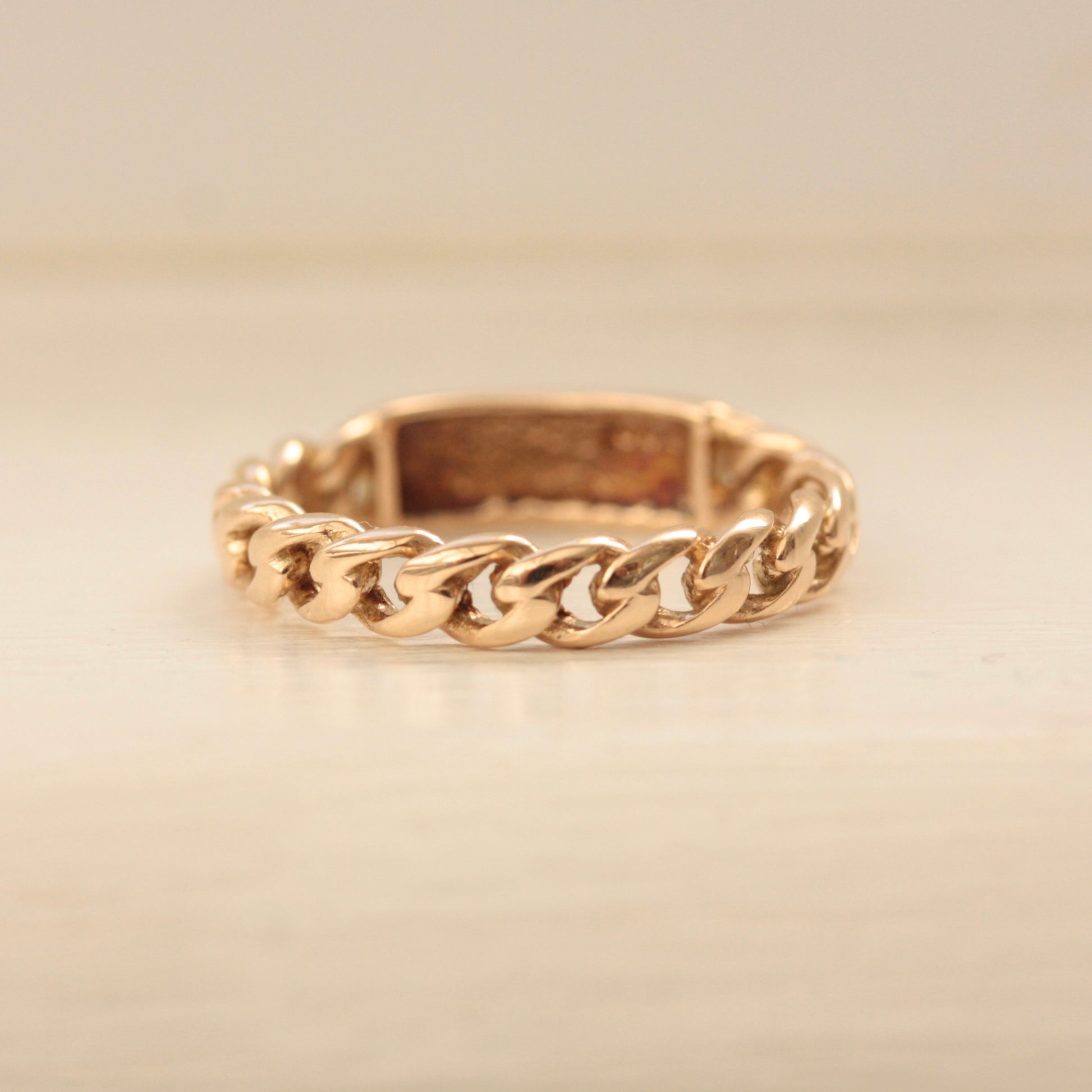 A solid 9ct gold 'identity' ring with a curb chain design and central blank plaque which could be engraved.