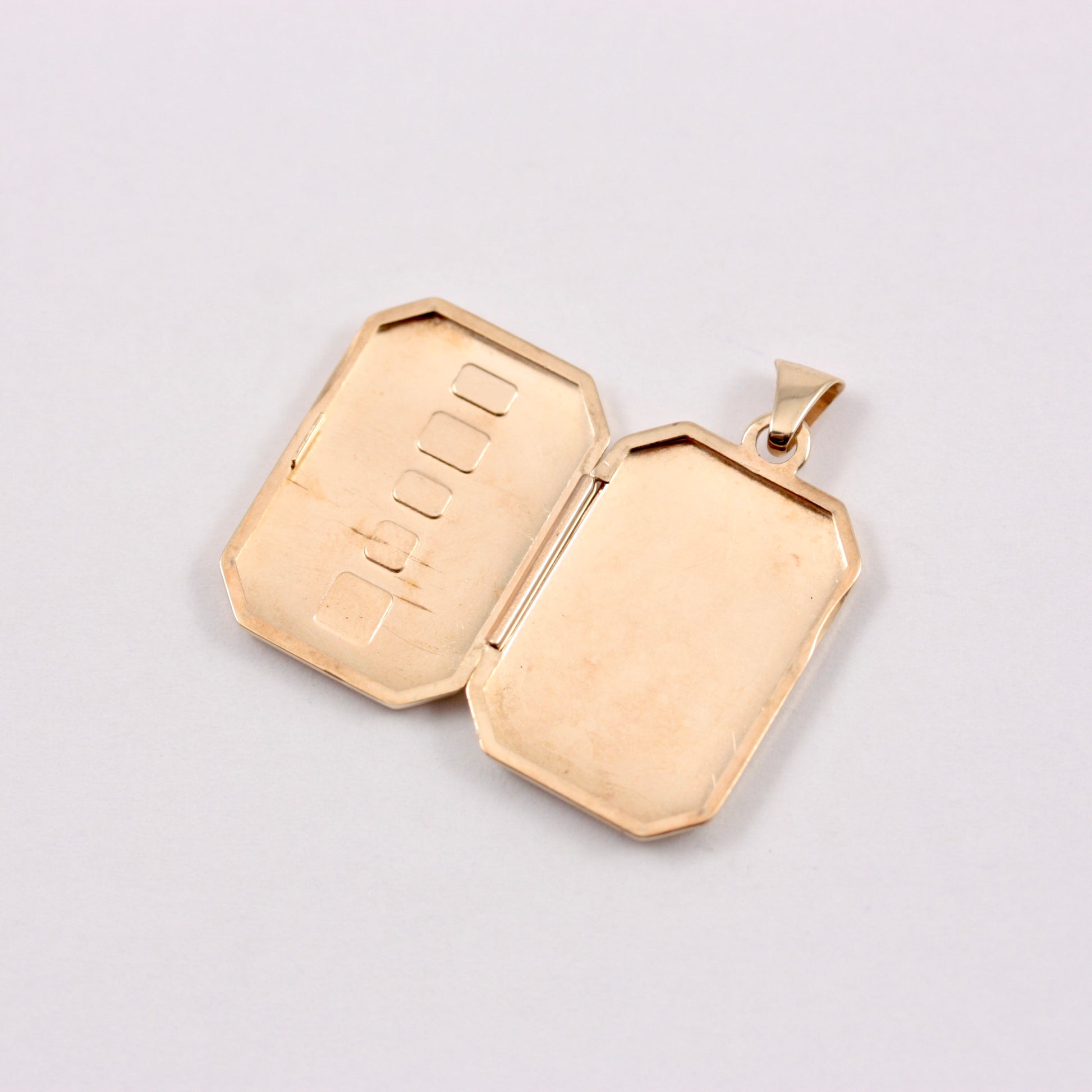 A really fun solid 9ct yellow gold rectangle locket. Cartouches have been stamped into the gold down the centre of the front of the locket, and a full set of hallmarks have been laser etched within.
