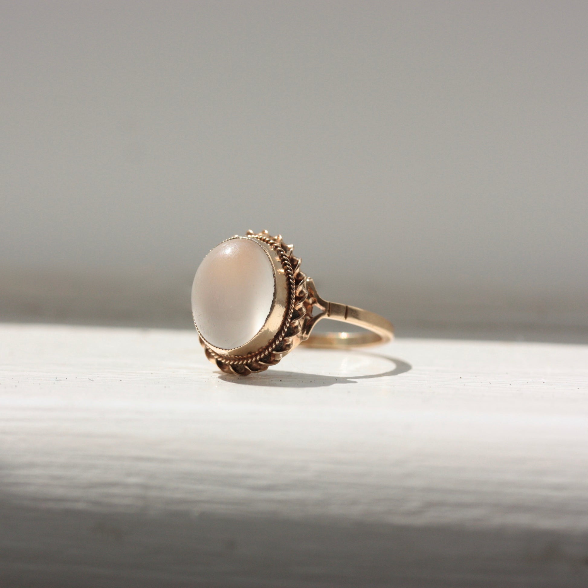 A pretty, 9ct yellow gold ring with rope framed translucent white moonstone.