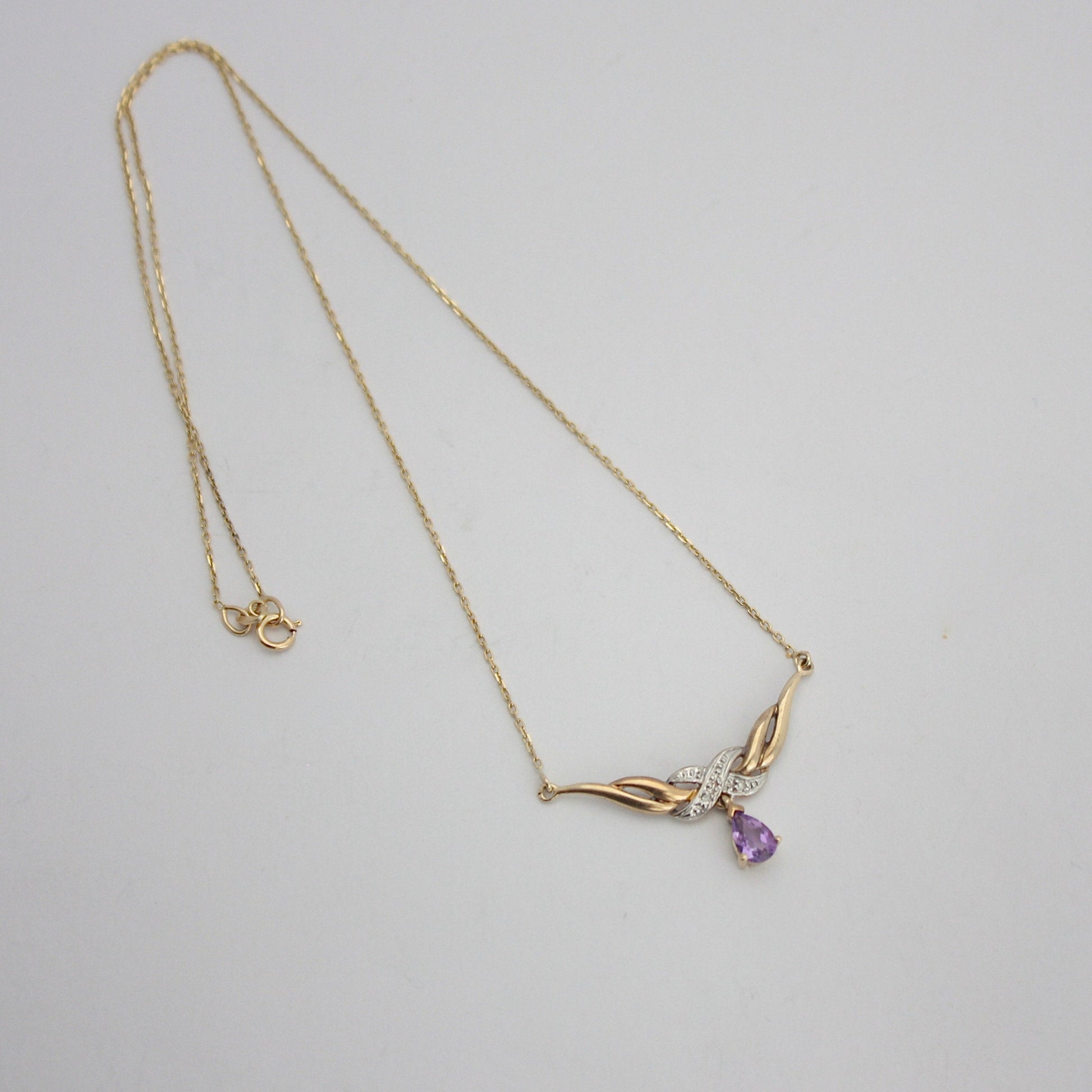 Vintage 9ct Gold Necklace with Pear Amethyst Drop and Diamonds, 80s / 90s