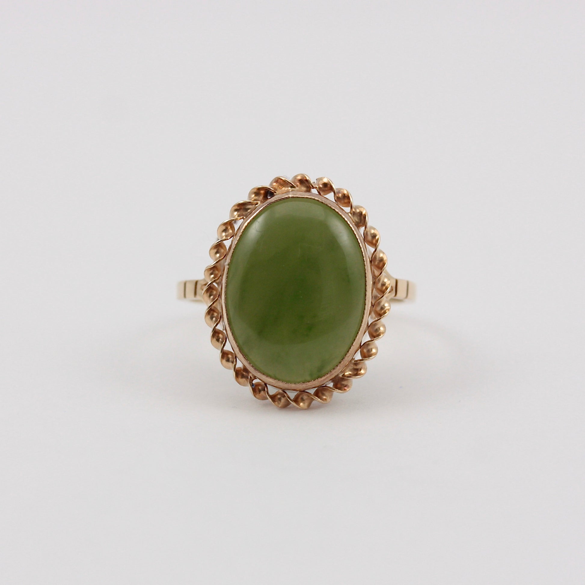 A solid 9ct yellow gold ring with rope framed nephrite jade.