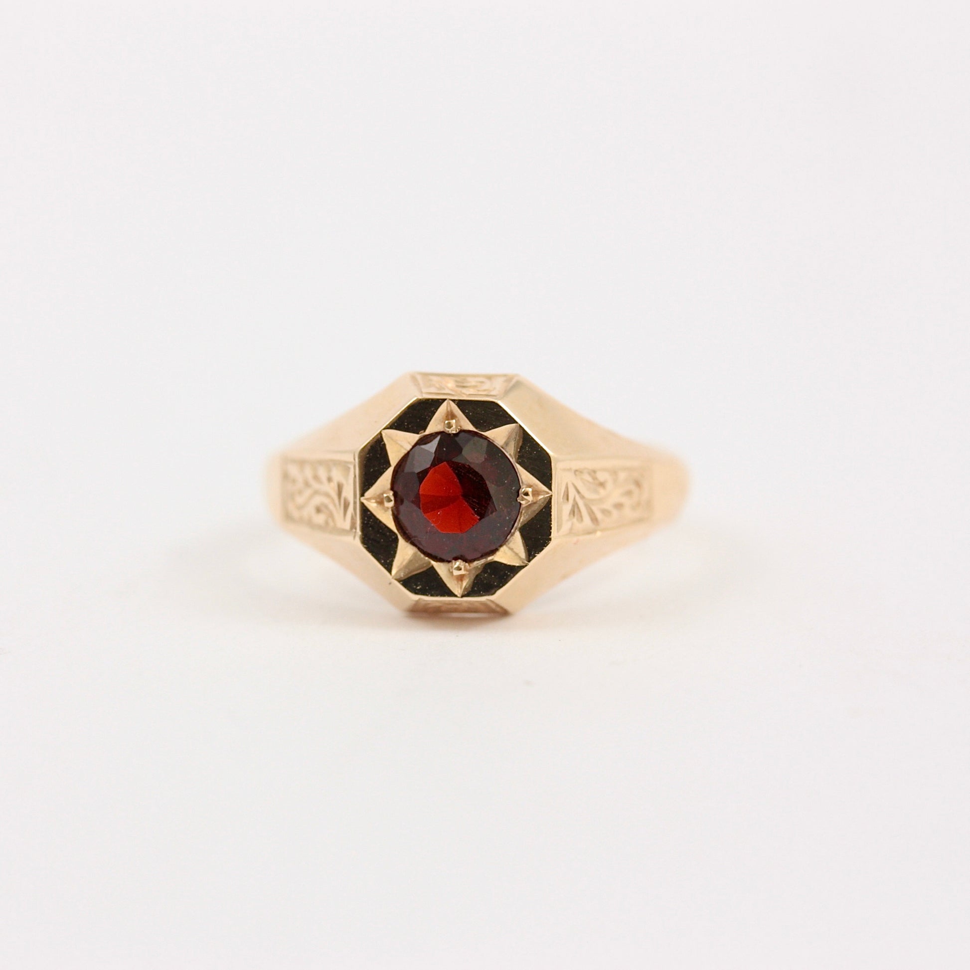 A vintage solid 9ct yellow gold octagonal shaped signet ring with star set garnet. Lovely quality.