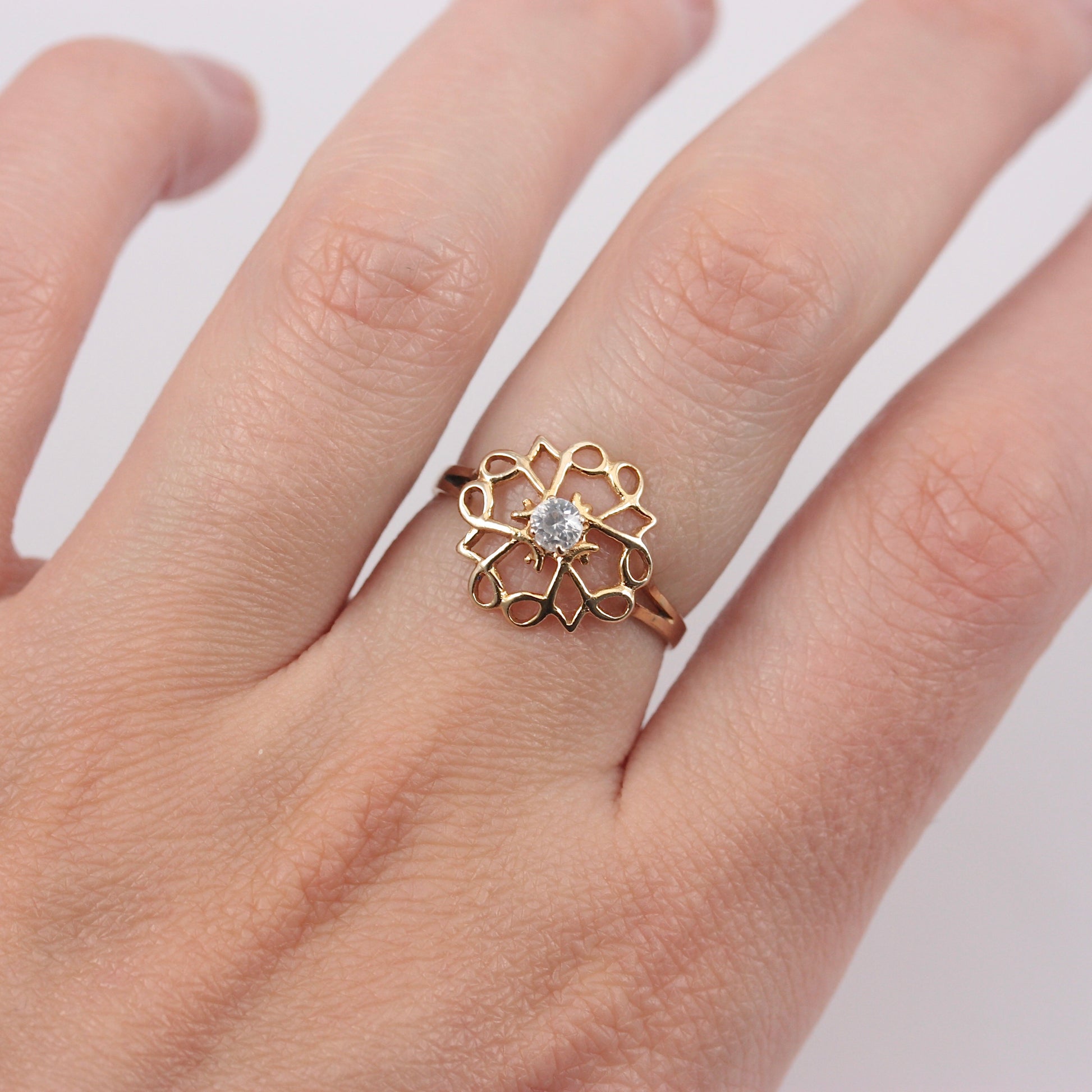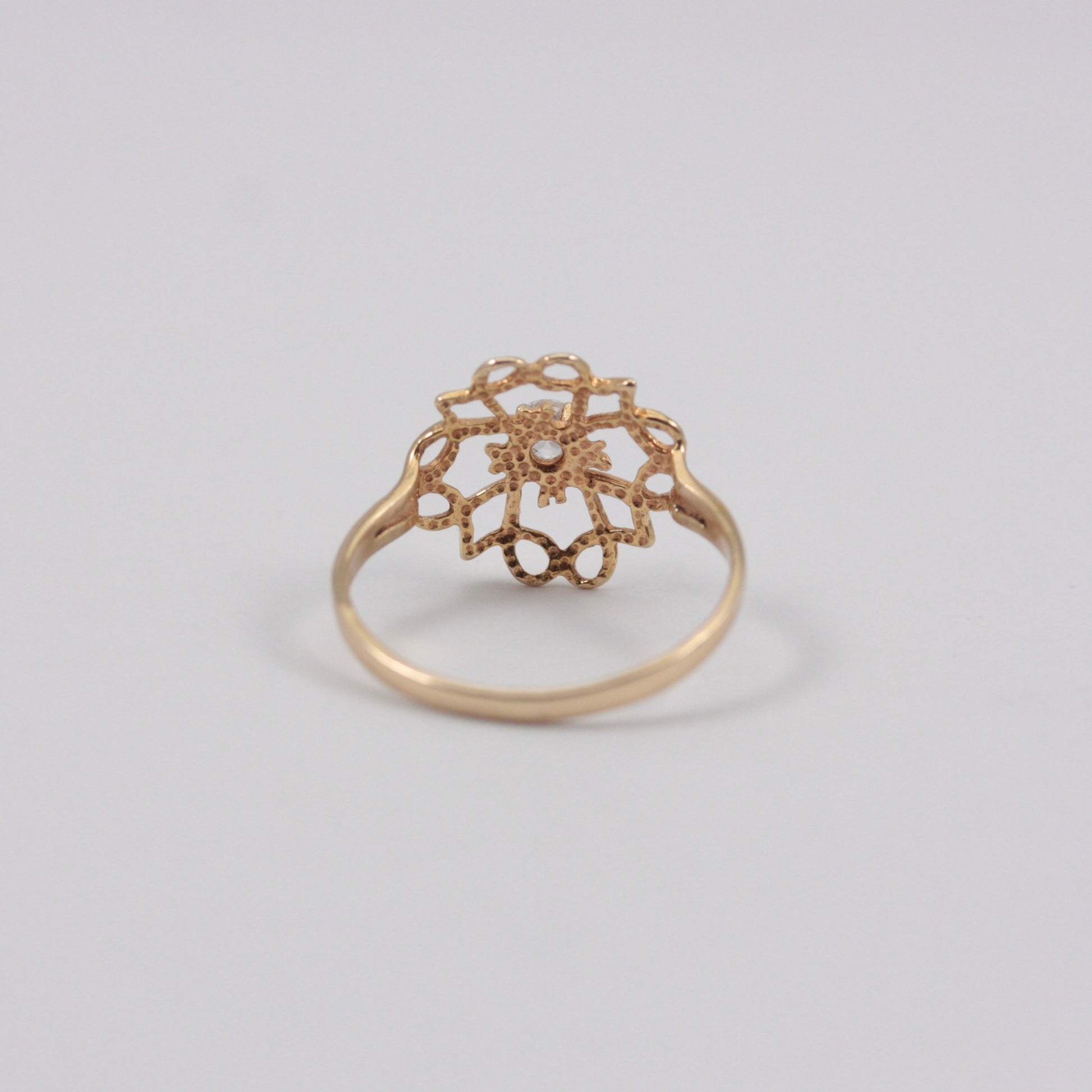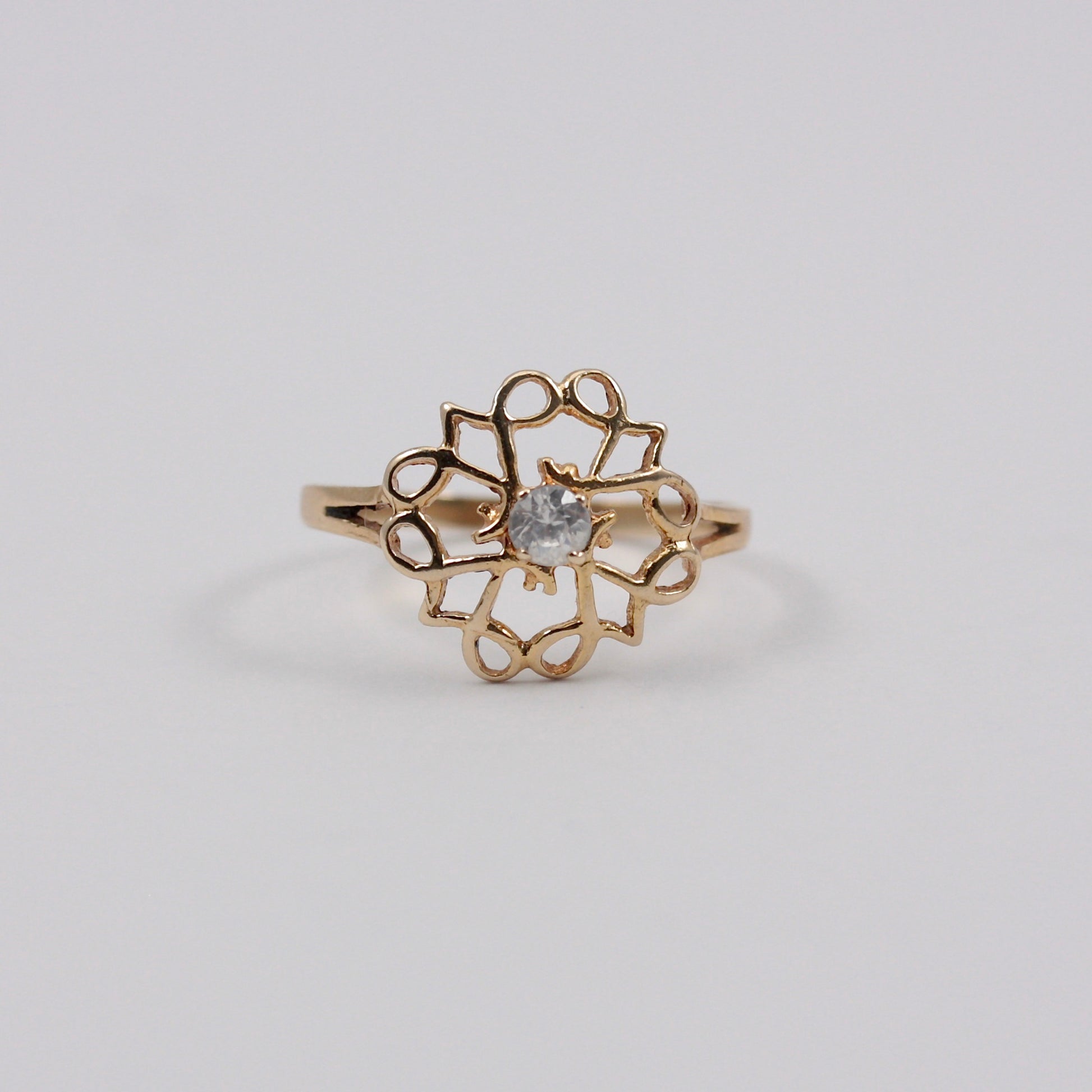 A solid 9ct yellow gold openwork ring set with a central clear crystal stone.