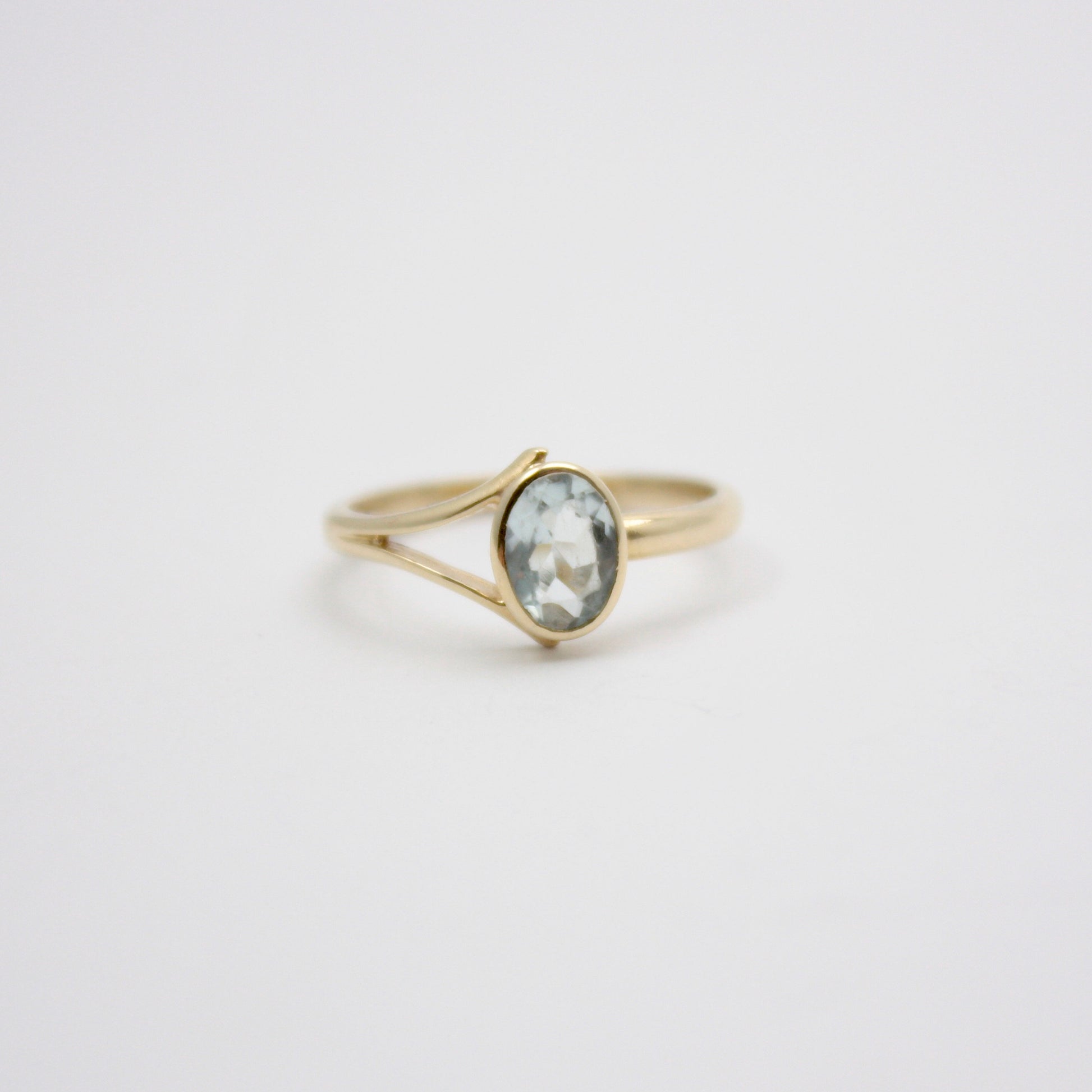 A vintage solid 9ct yellow gold modernist style ring, with an oval cut pale aquamarine.