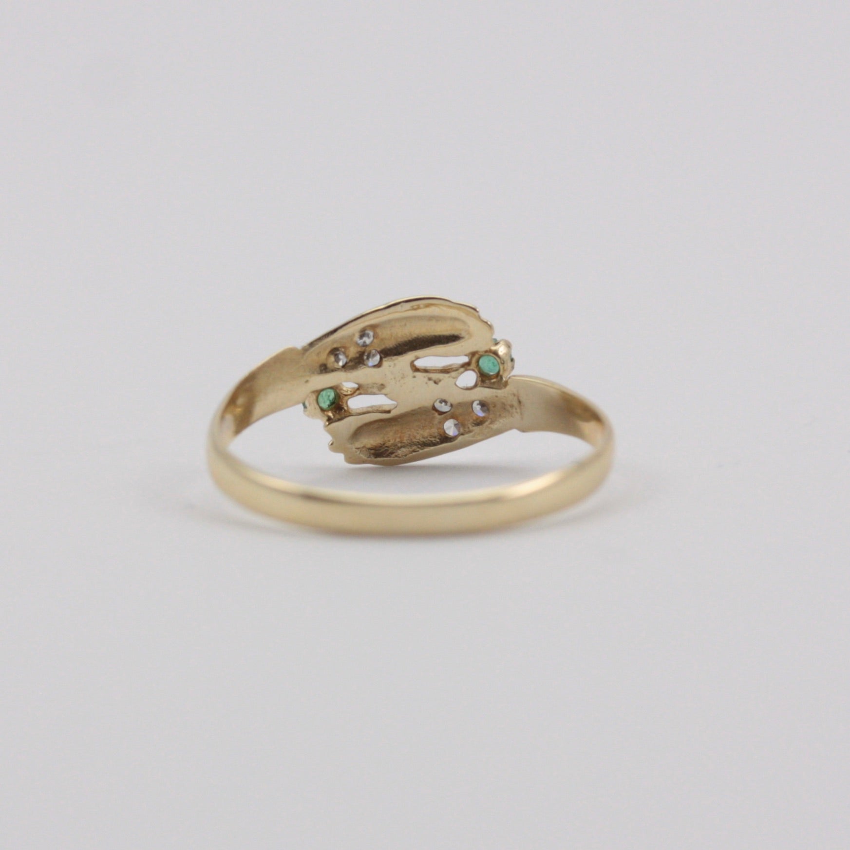 An unusual take on the friendship / fede ring. This 9ct gold ring features a pair of hands which appear to wrap around the finger. It is set with two small emeralds and six tiny diamonds.