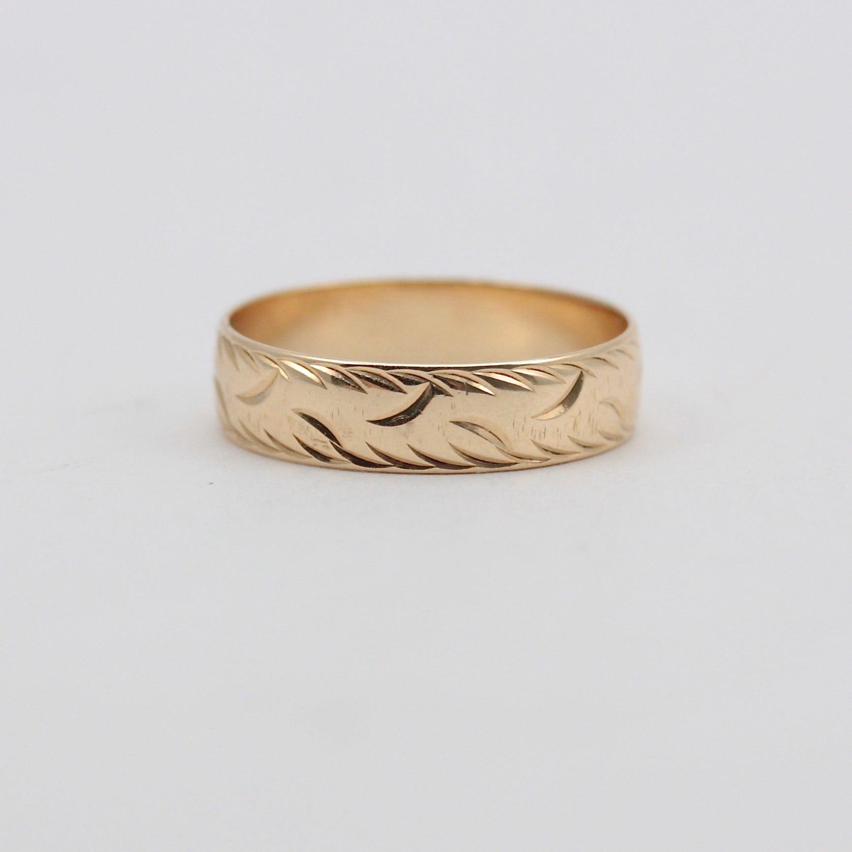 Vintage solid 9ct yellow gold patterned band ring.