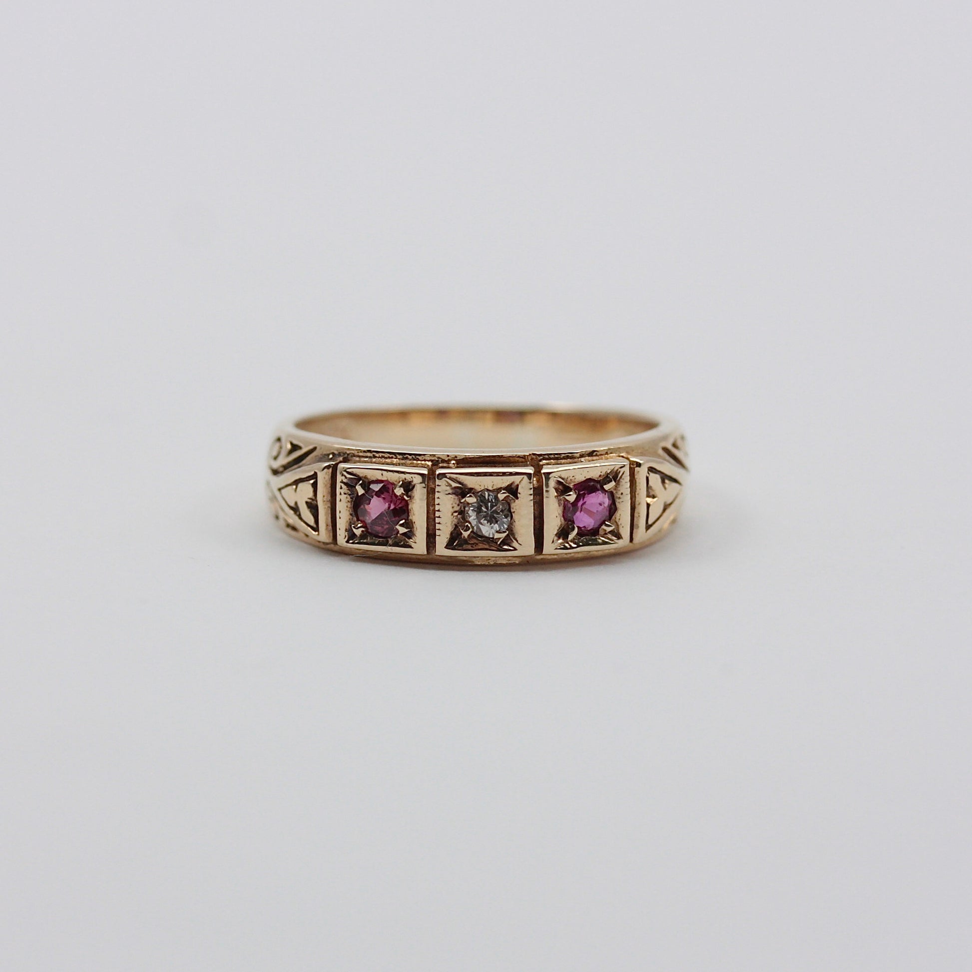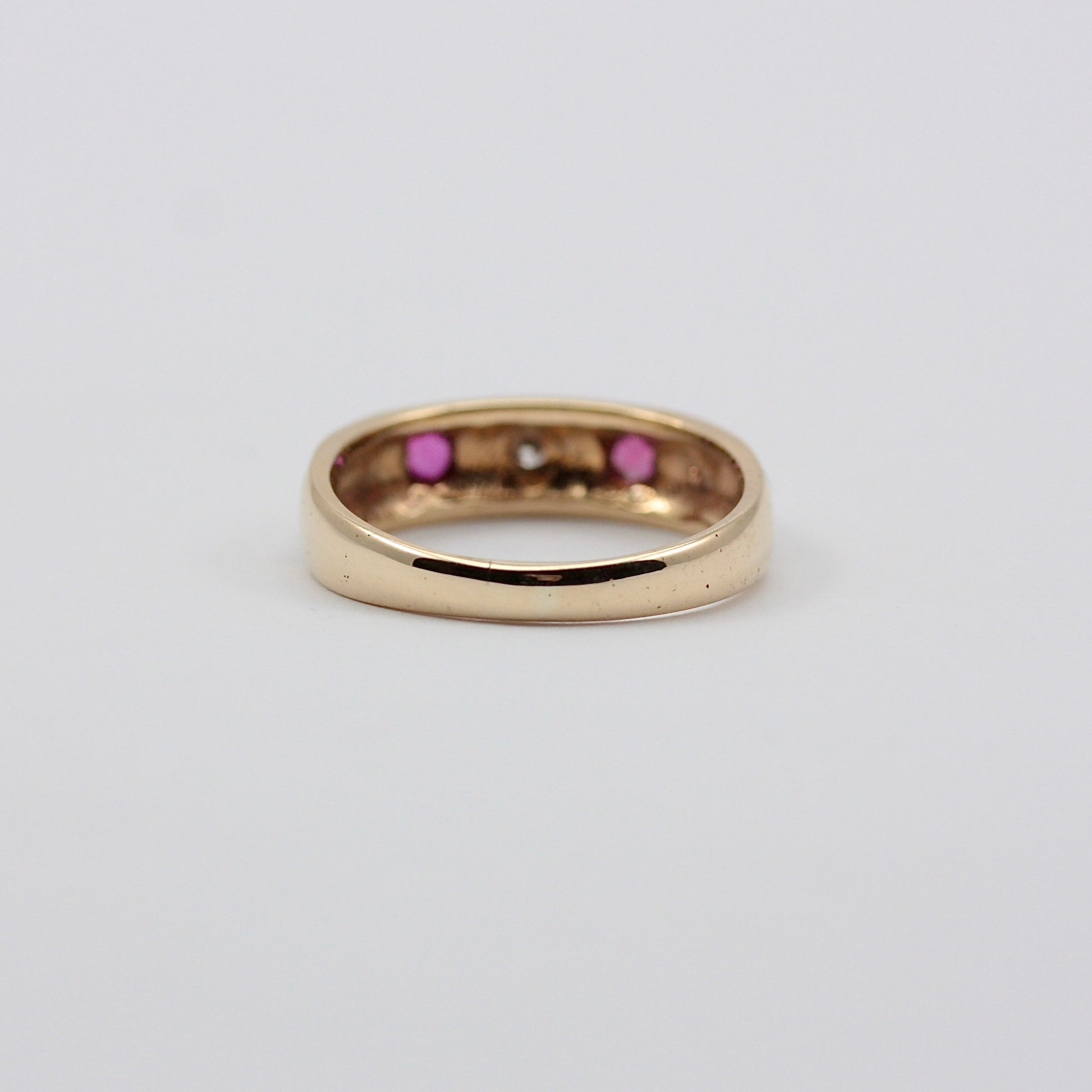 Vintage 9ct Gold Ruby and Diamond 3 Stone Band Ring.