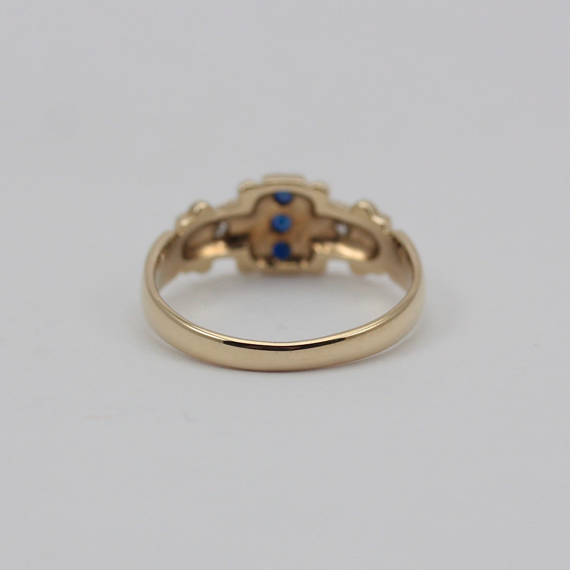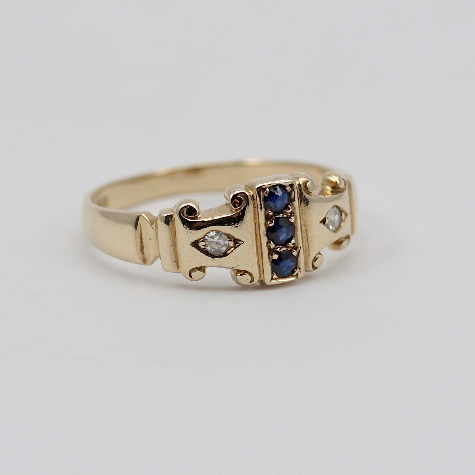 Vintage 9ct gold ring in an antique style, with three small dark sapphires and two small diamonds.