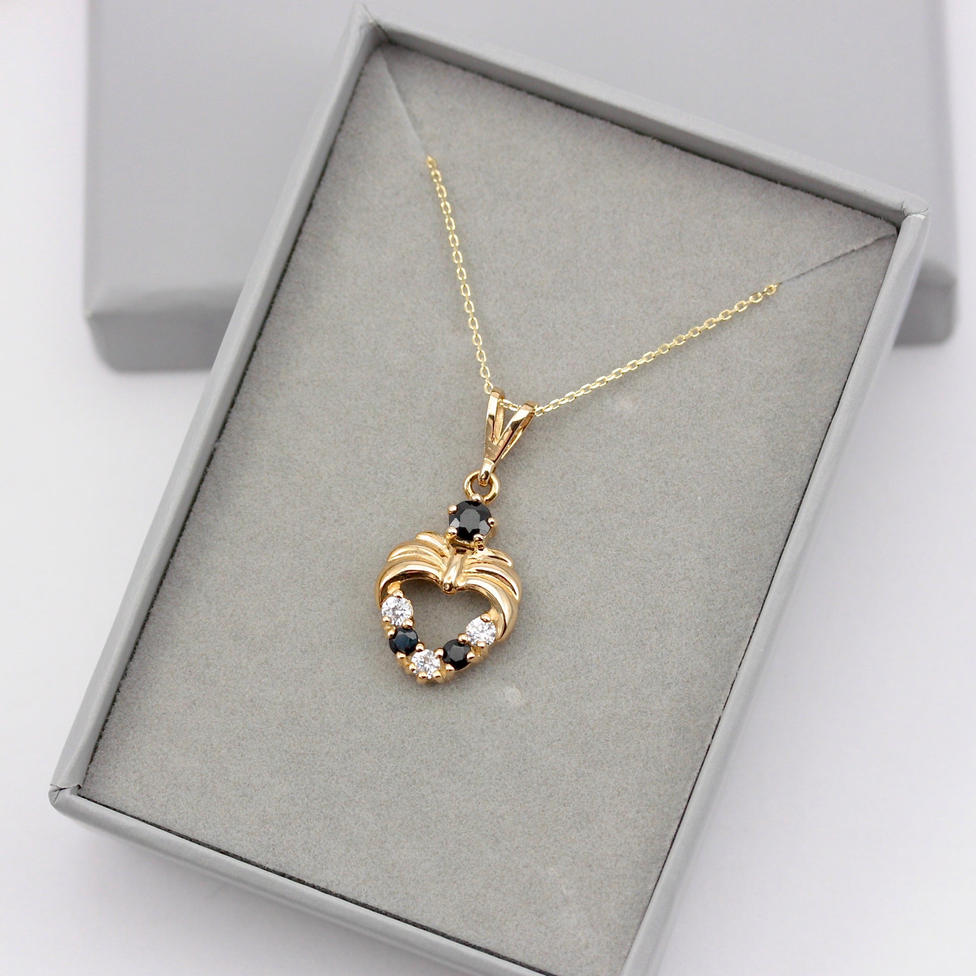 Vintage 9ct gold open heart pendant set with dark (almost black) sapphires and white cubic zirconias. Comes with fine solid 9ct gold chain.