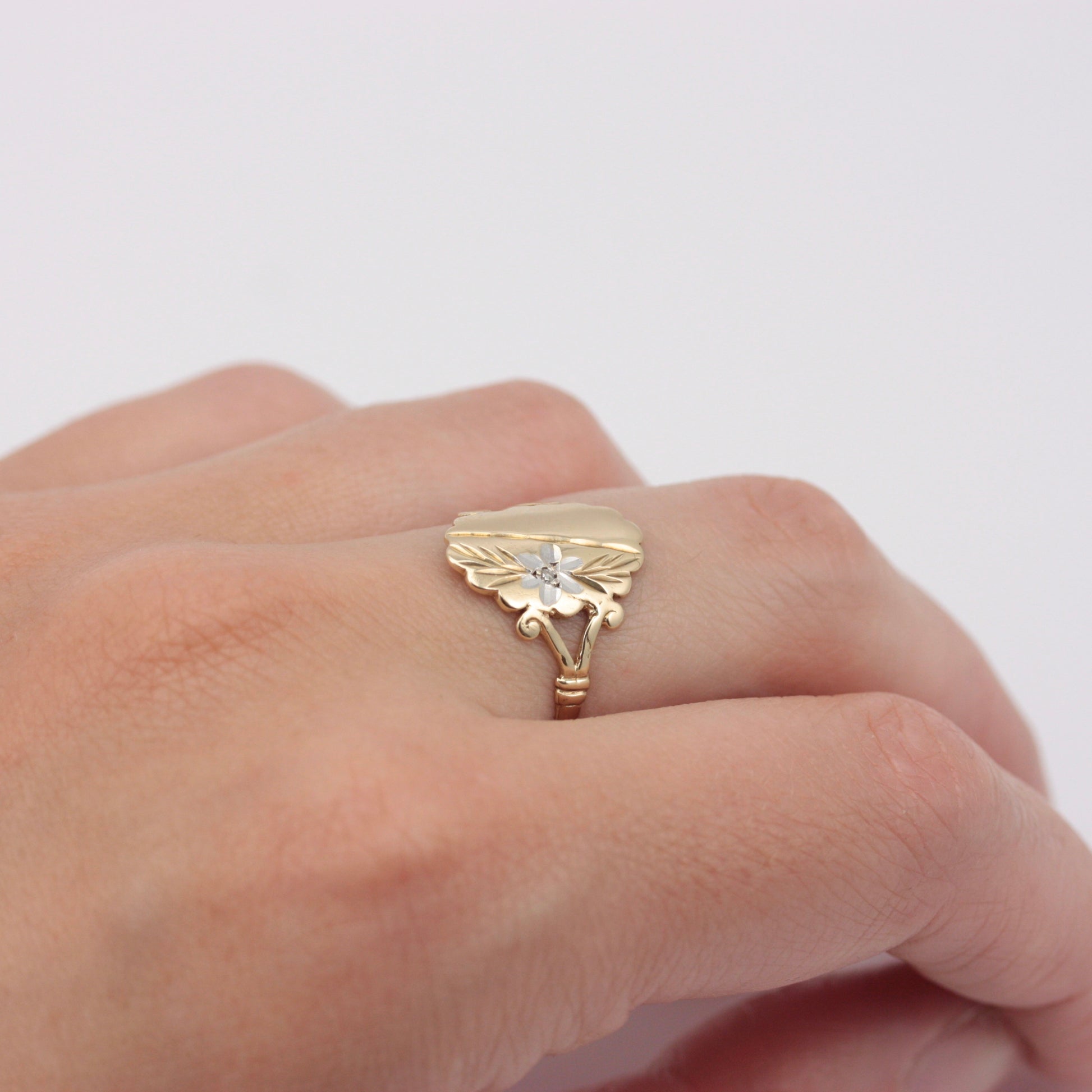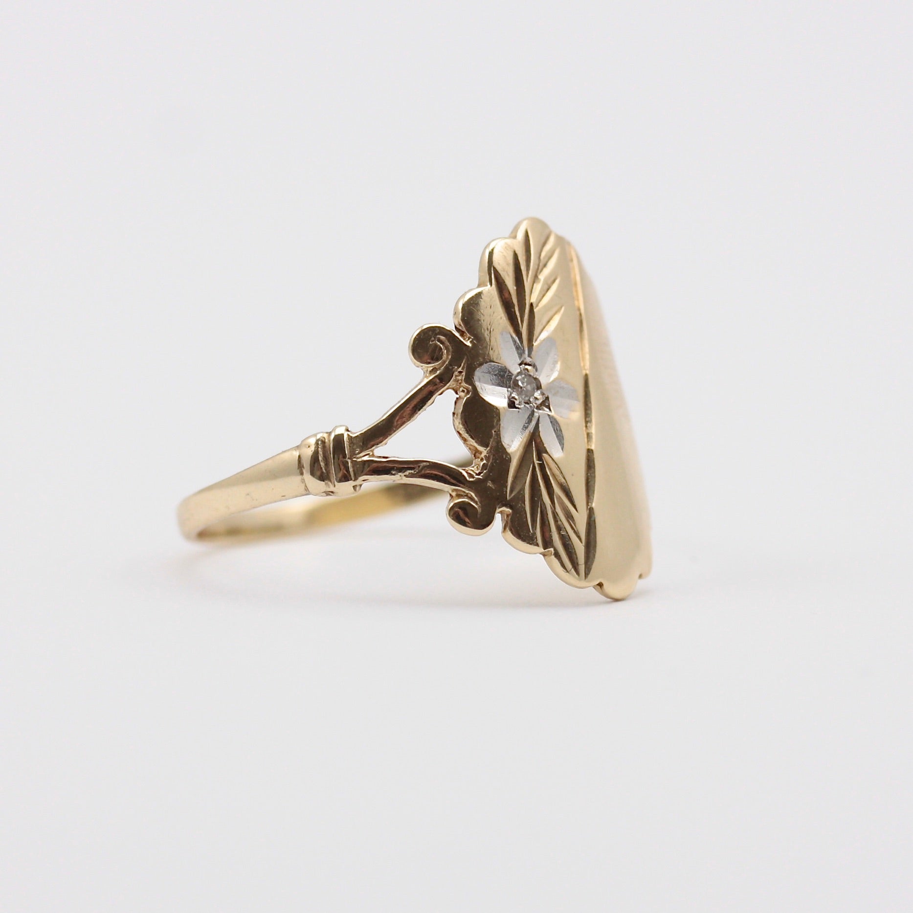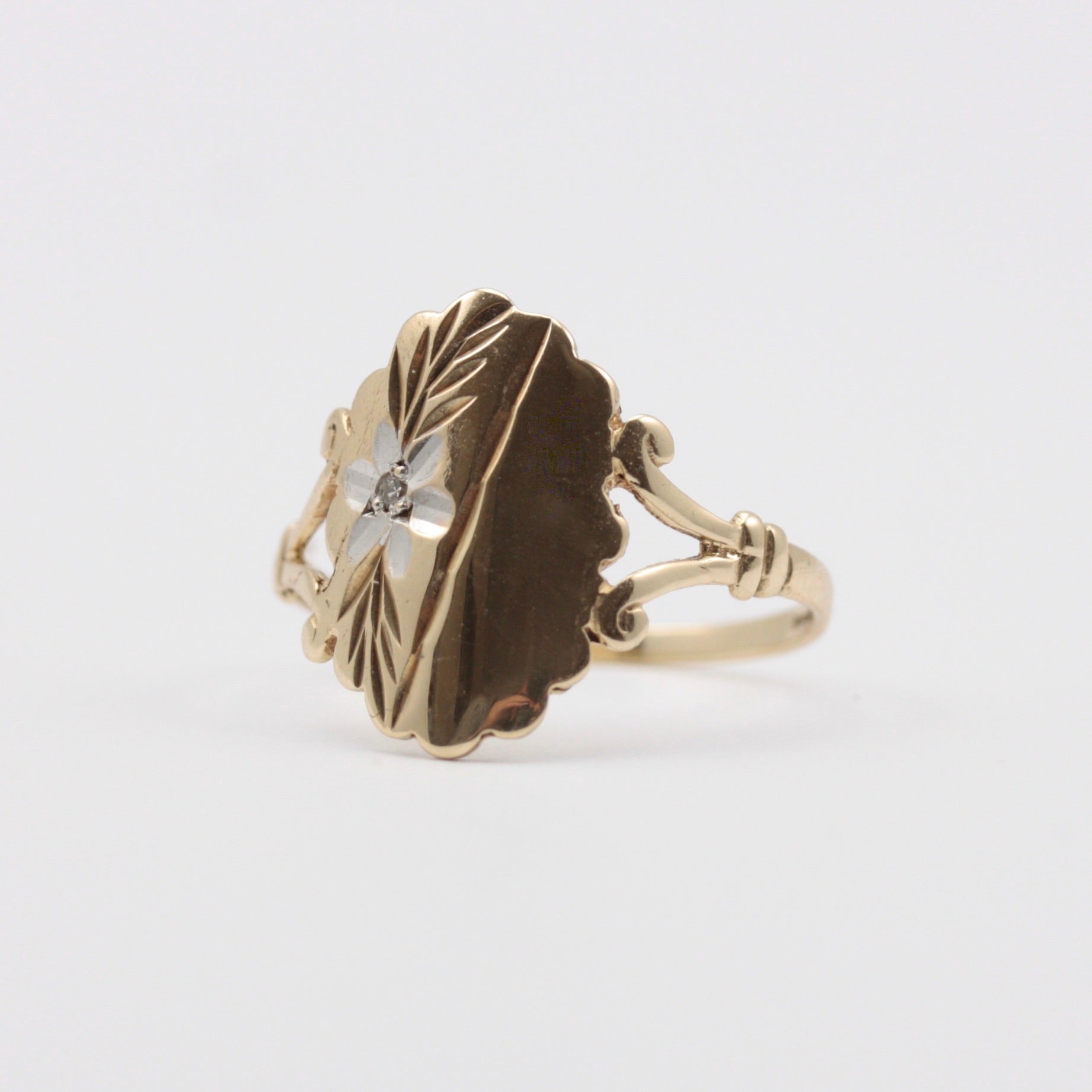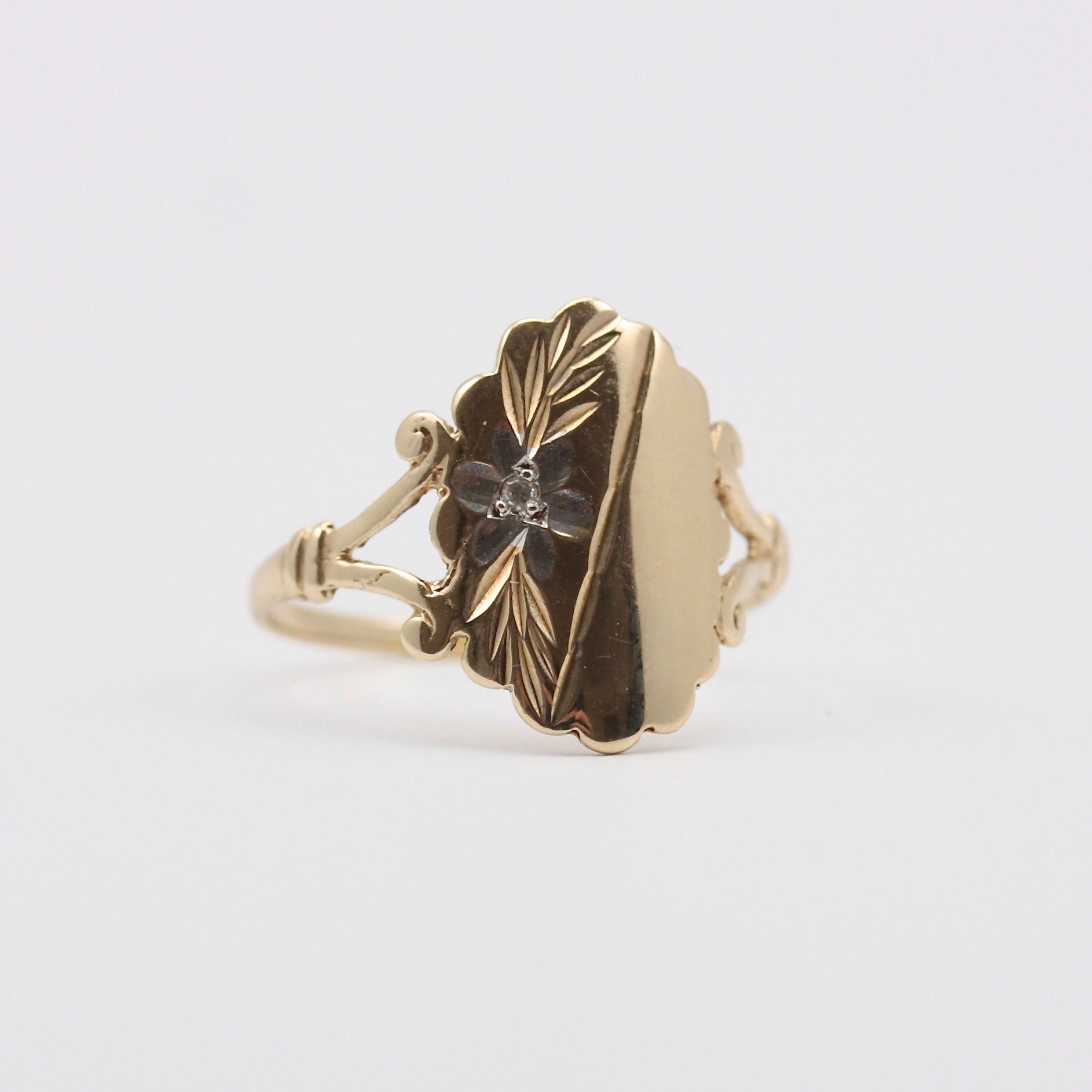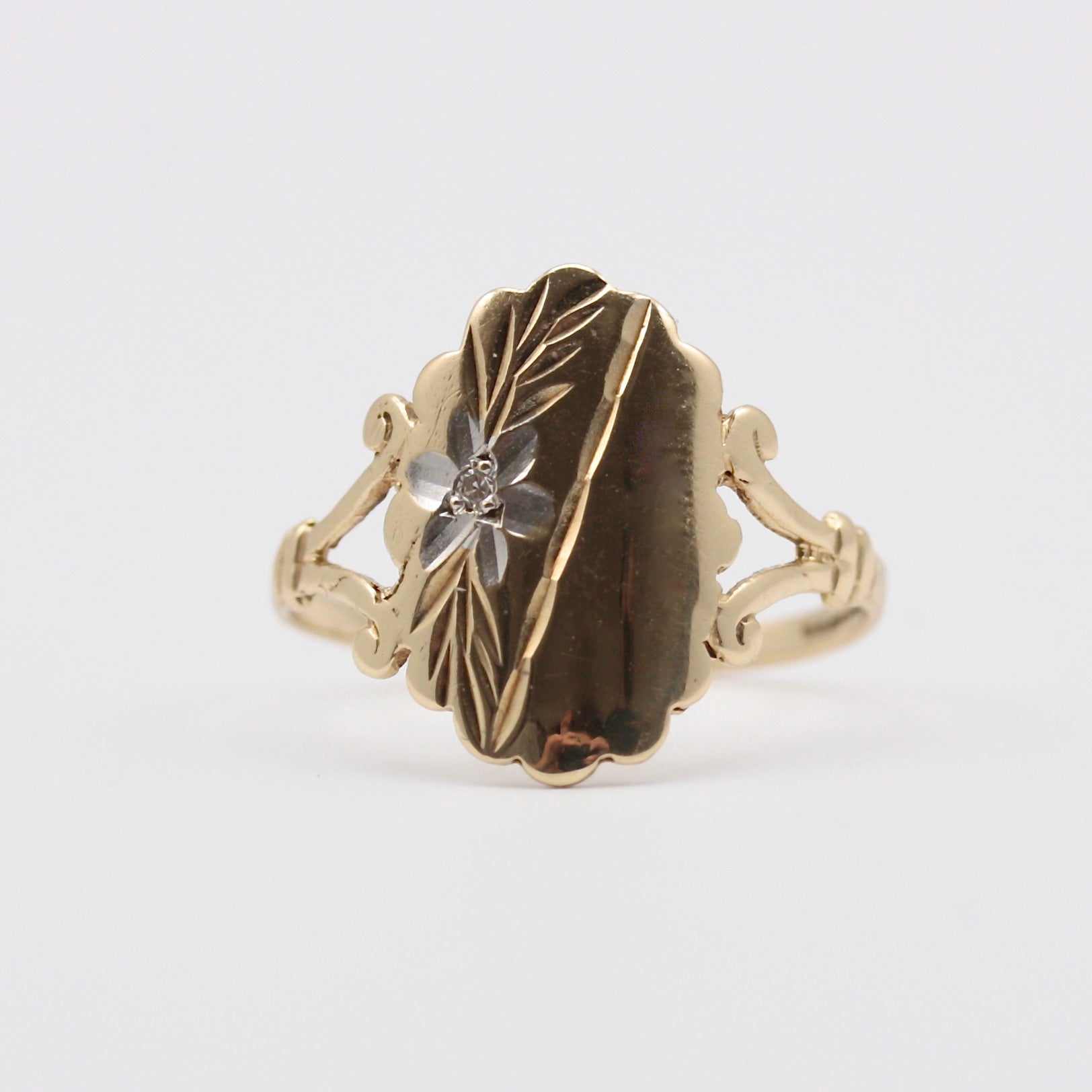 A 9ct yellow gold scalloped oval plaque ring with engraved floral design and set with a tiny diamond.