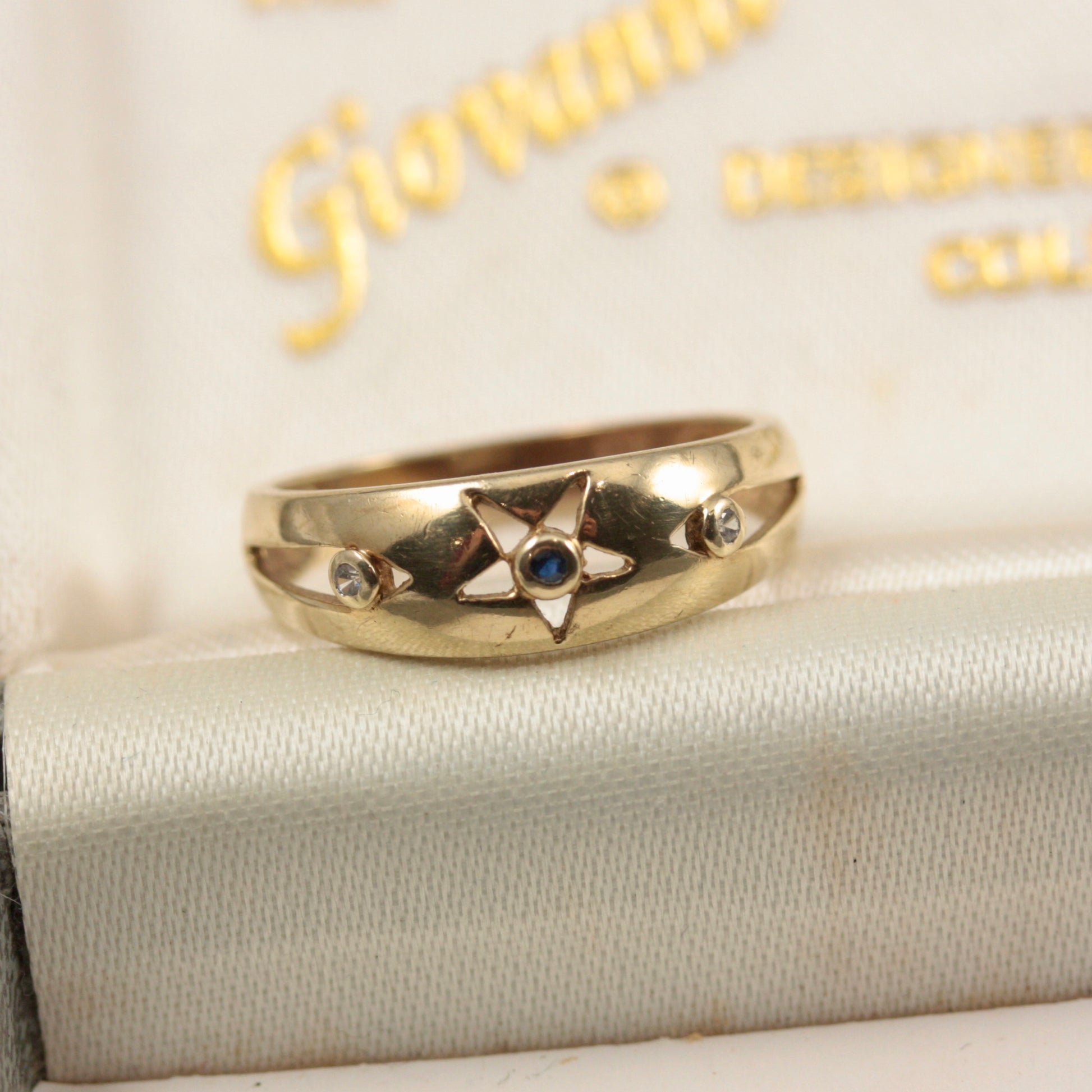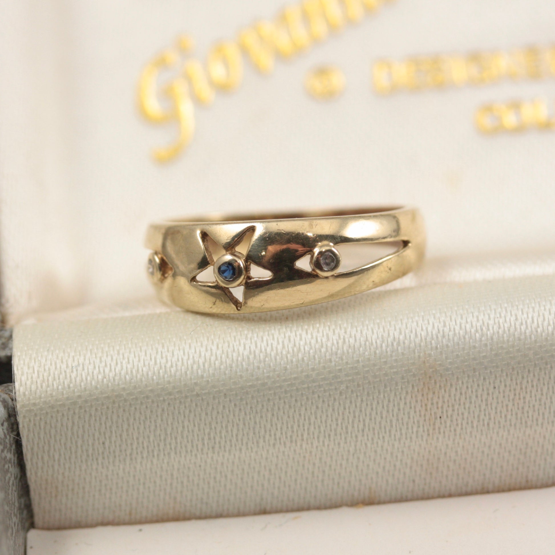 A vintage 9ct yellow gold band style ring, with central cut out star detail and set with tiny blue and colourless lab created spinel.