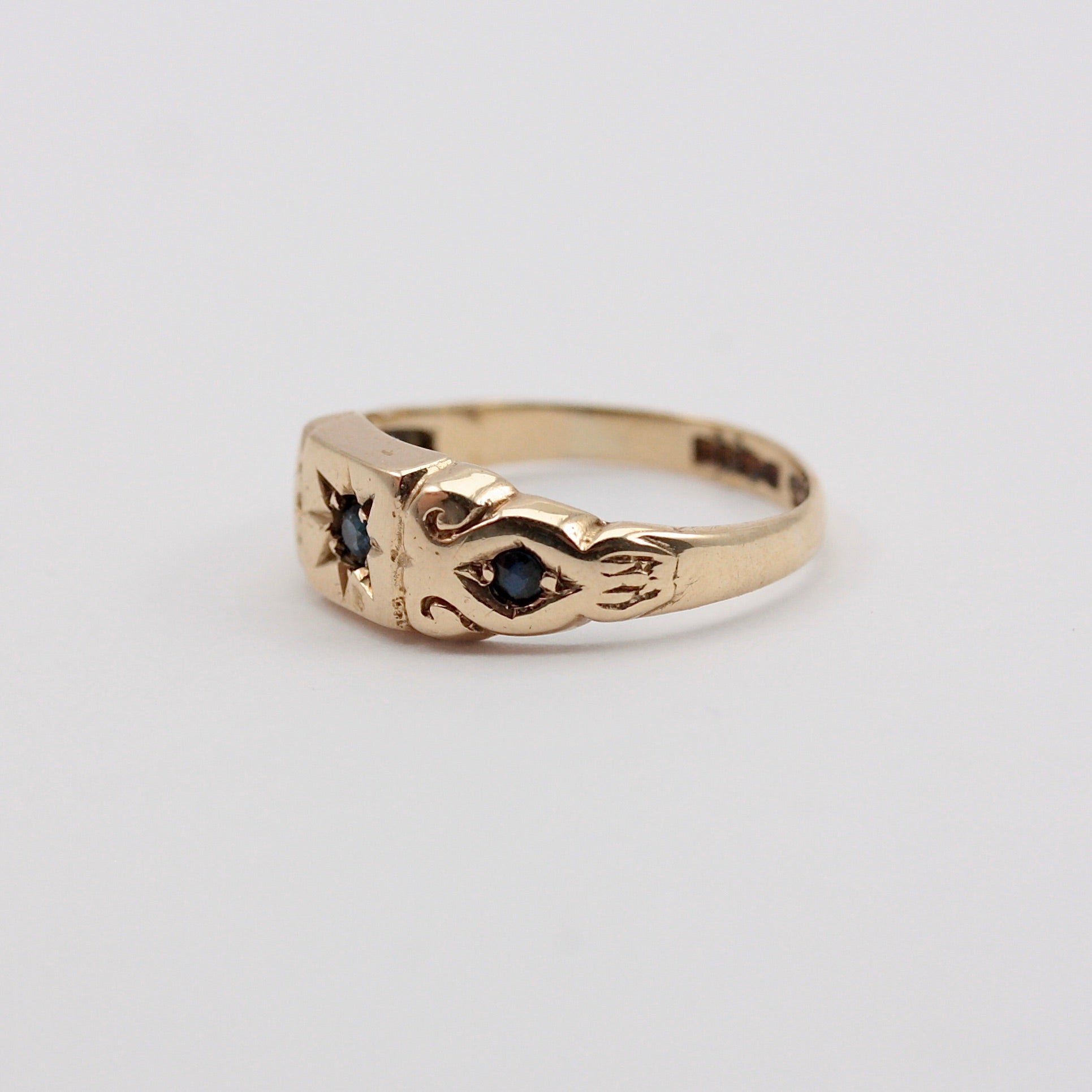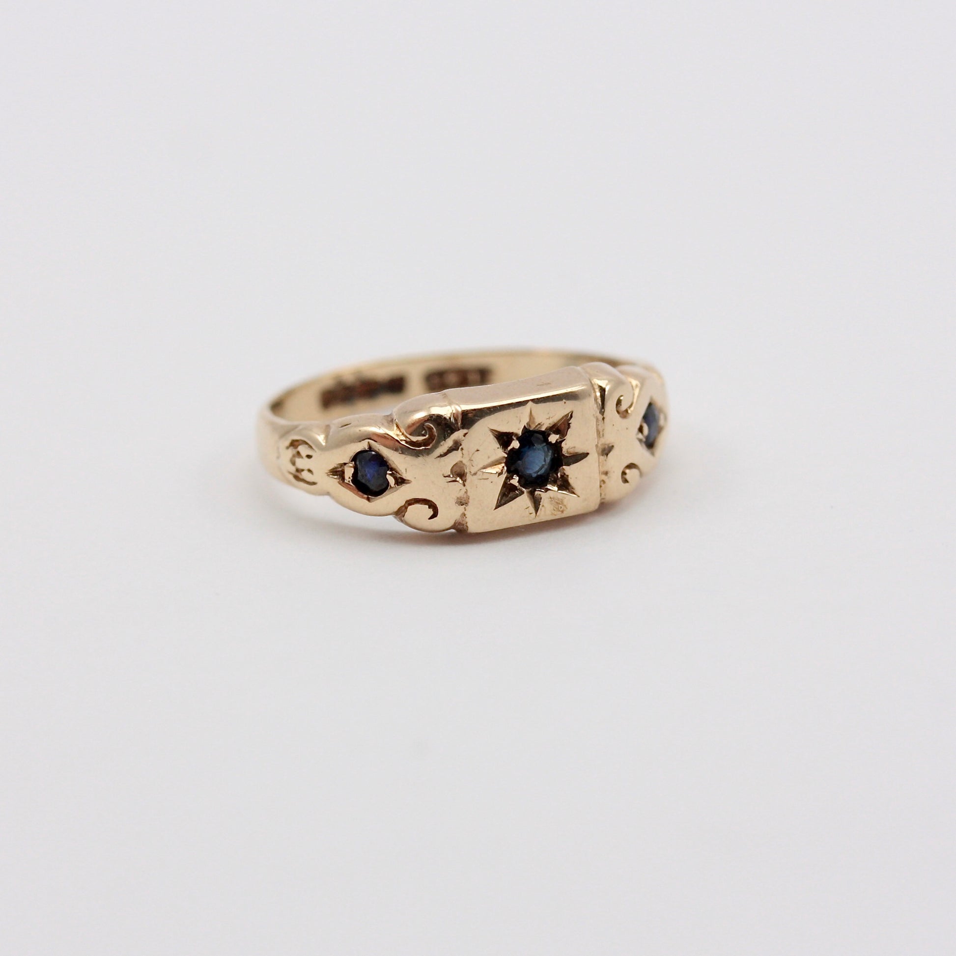A solid 9ct yellow gold ring in an antique style with three dark sapphires, the central sapphire in a star setting.