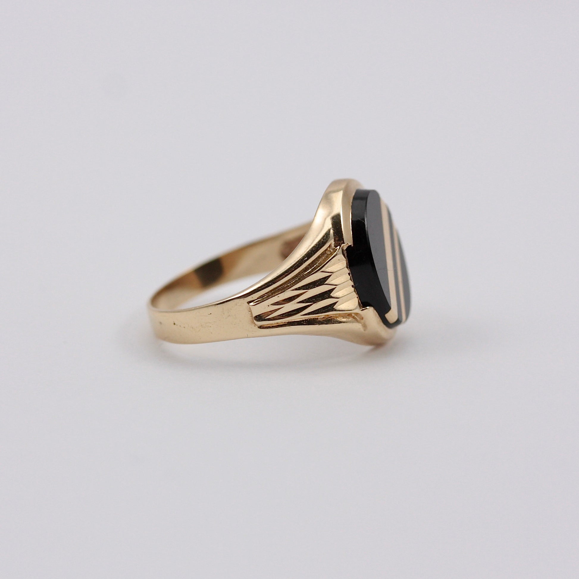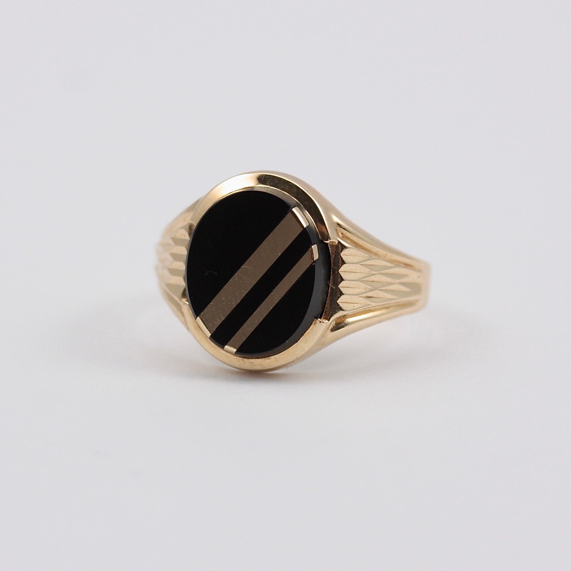 A vintage solid 9ct gold onyx signet ring with gold striped detail and textured shoulders.
