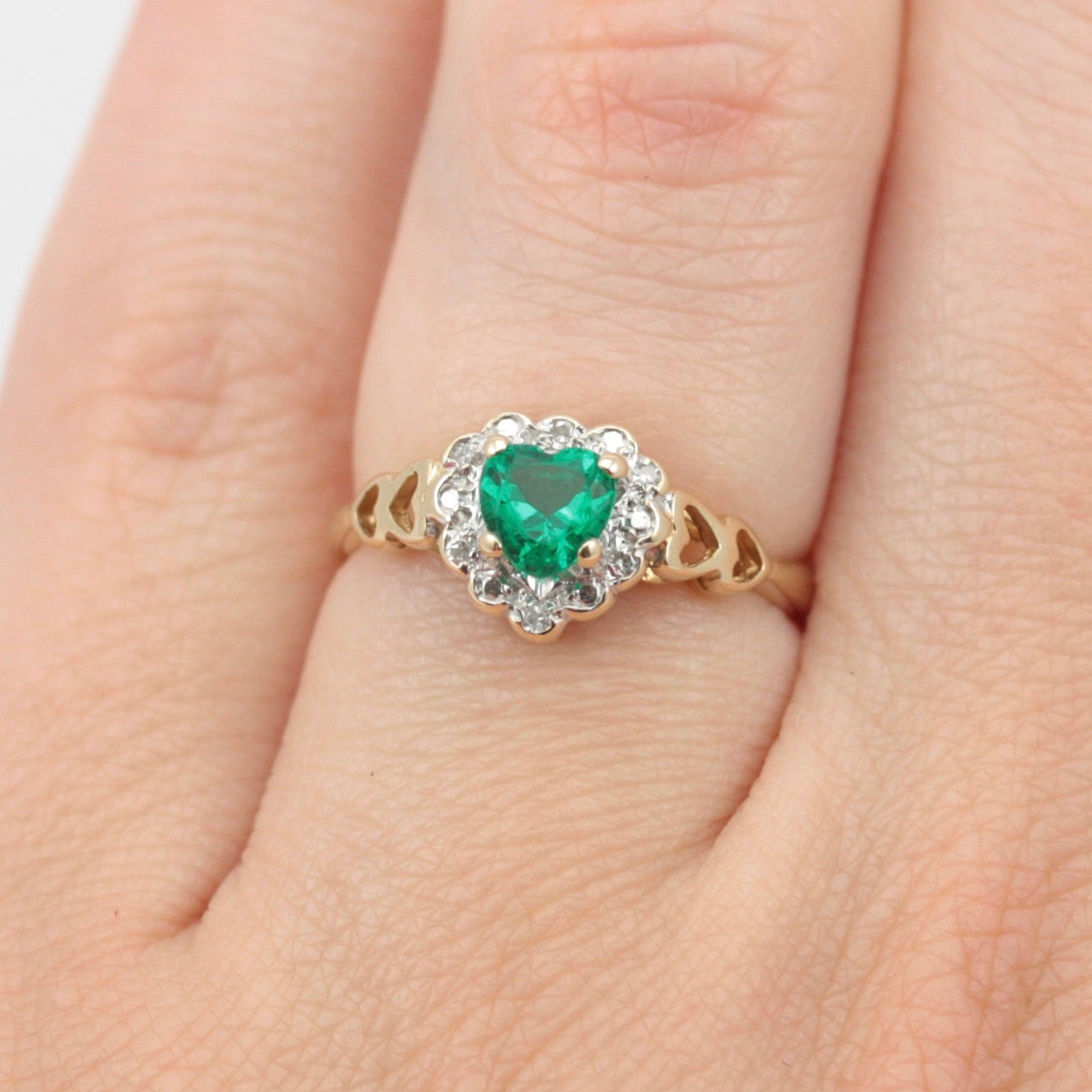 Vintage 9ct gold heart cluster ring with a central lab created vivid green emerald, surrounded by small diamonds.