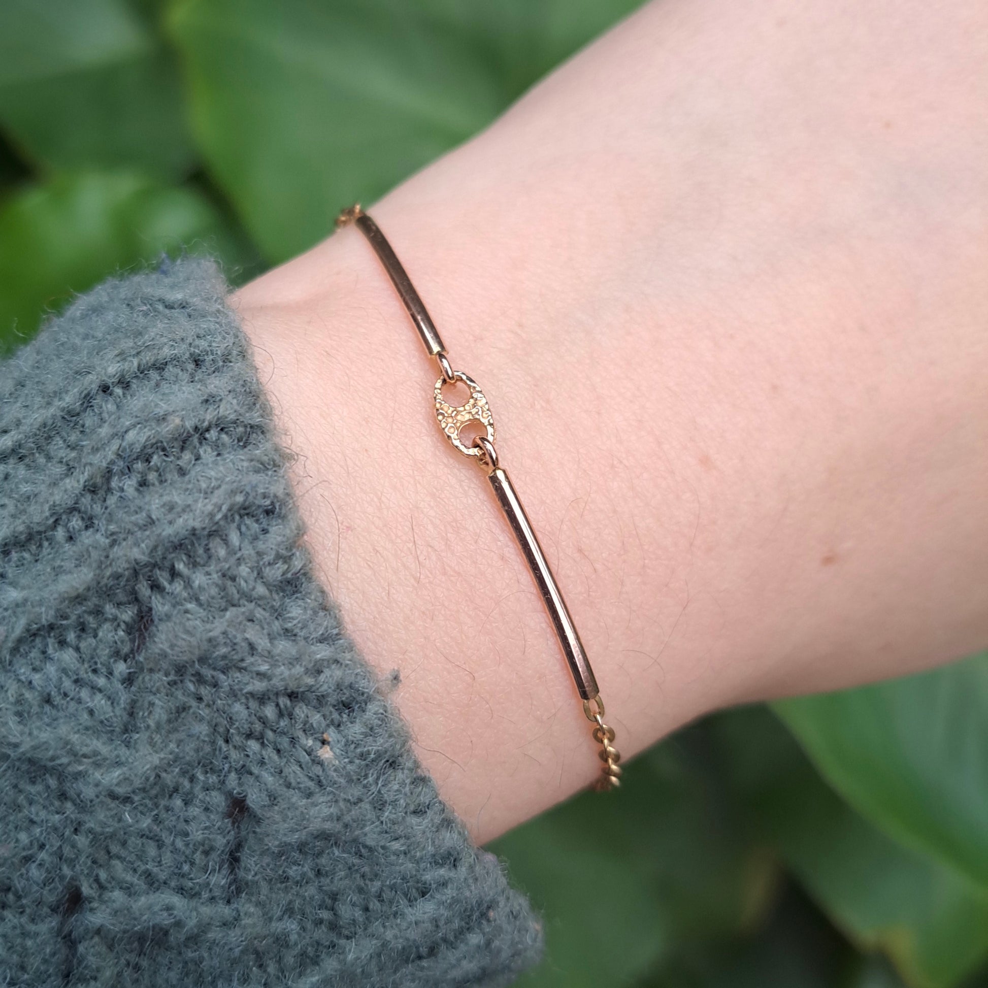 A vintage 9ct Italian gold bracelet with cable chain, bar links and a central hammer finished mariner link. The gold has a slight rosy tint.