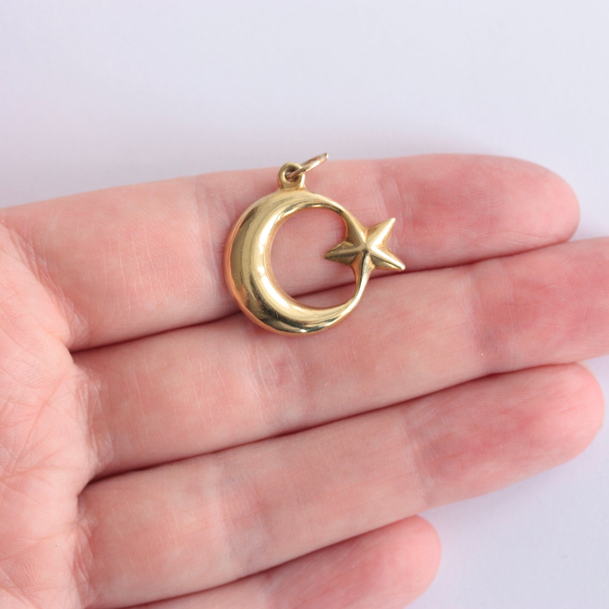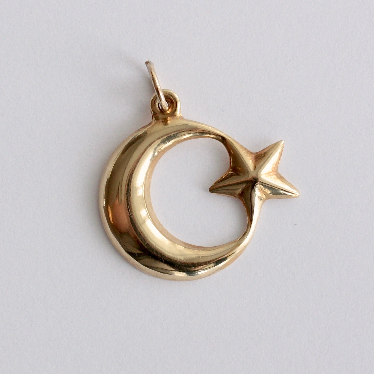 Vintage Yellow Gold Crescent Moon and Star Pendant